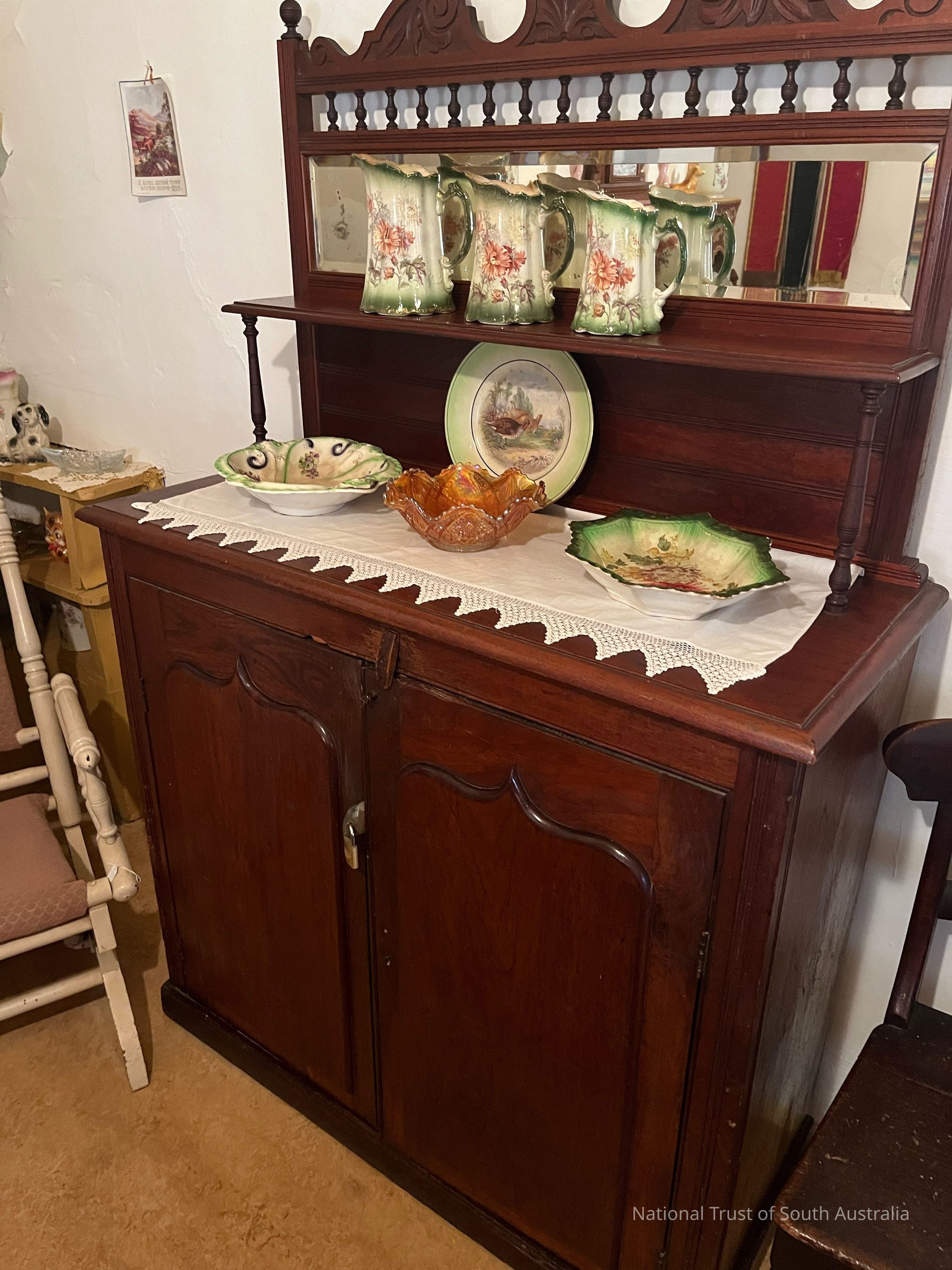 Large cabinet with mirror, shelves and locked compartment. Locked compartment contains miscellaneous items (such as extra dishes).