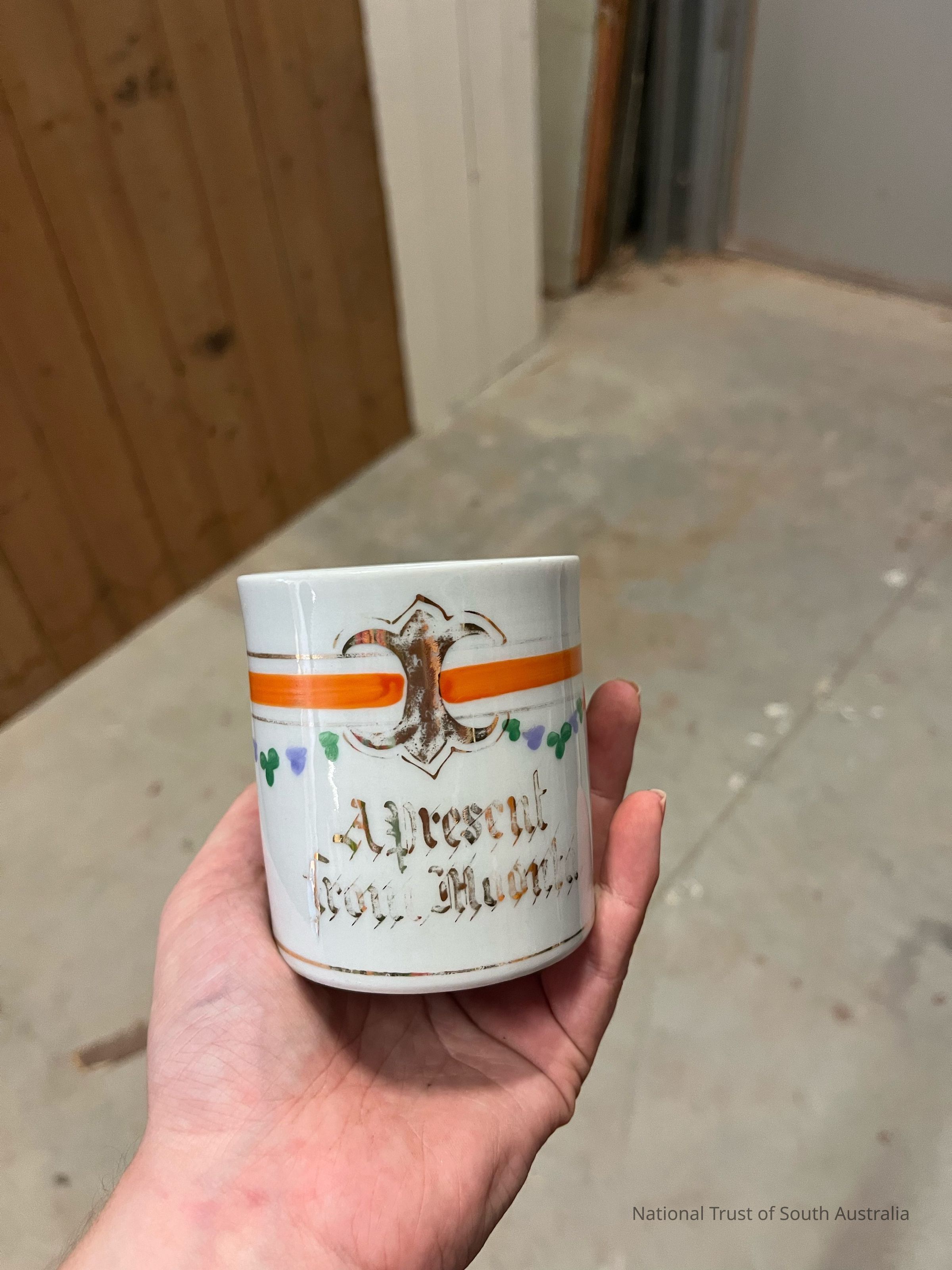 Small ceramic cup with “A Present From Moonta” written on one side. The cup is missing it’s handle. Located in Box 9K