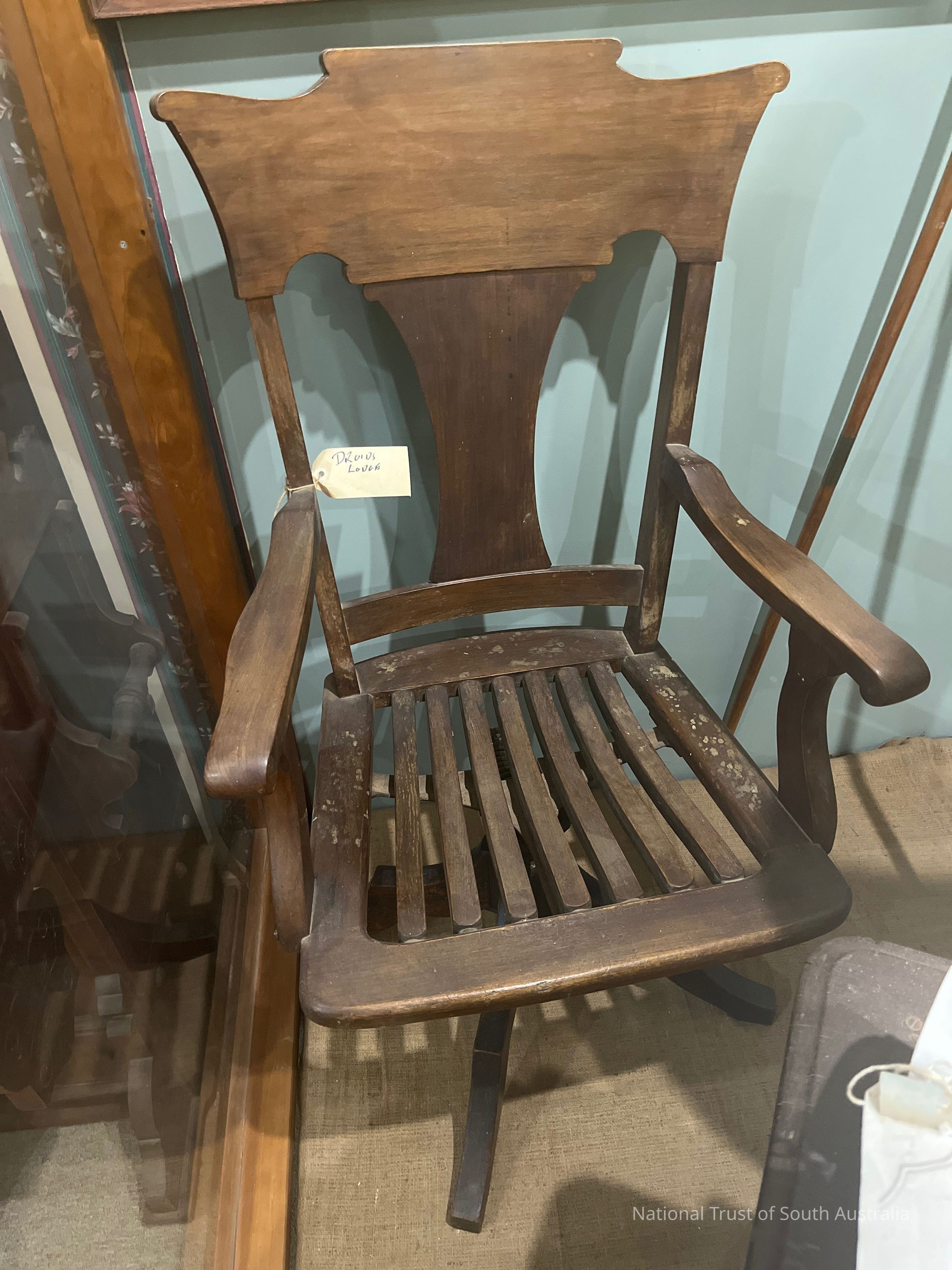 Wooden chair, with ability to rotate. Tag reads: Druids Louge