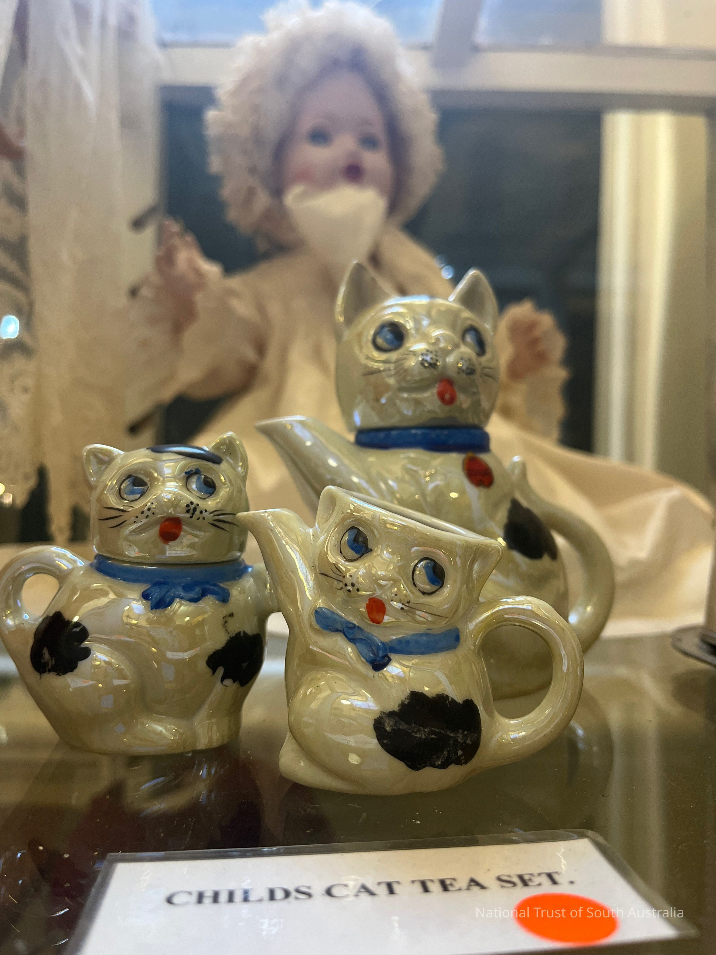 Three piece tea set shaped like cats. Includes a teapot, sugar jar and milk jug.