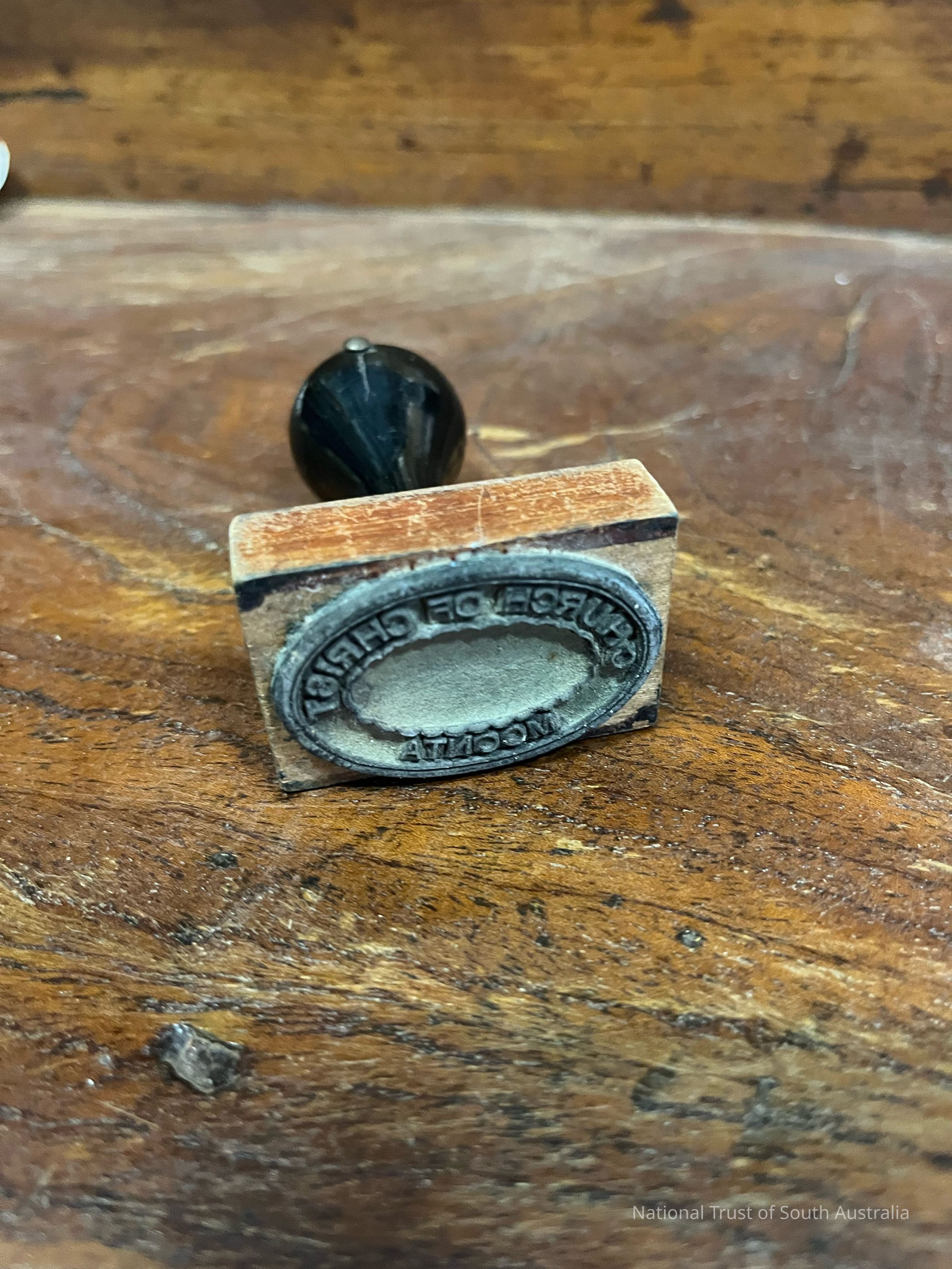 Wooden stamp embossed with CHURCH OF CHRIST MOONTA Located in Box 15K