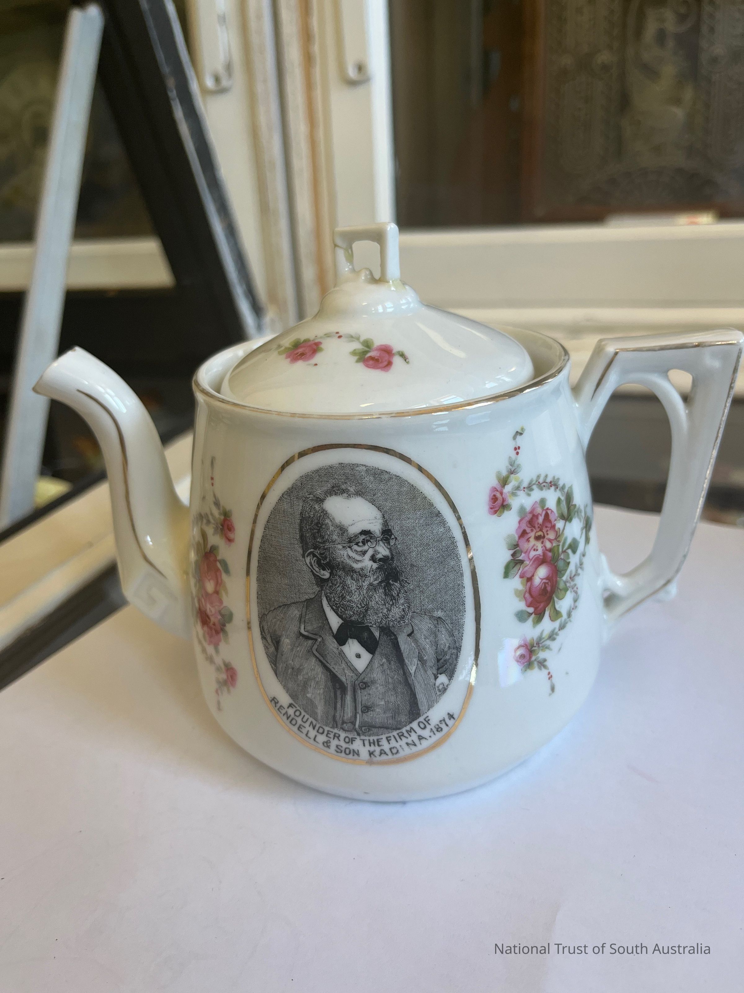 Commemorative teapot with portrait of the founder of the firm Rendell & Son, Kadina, 1874