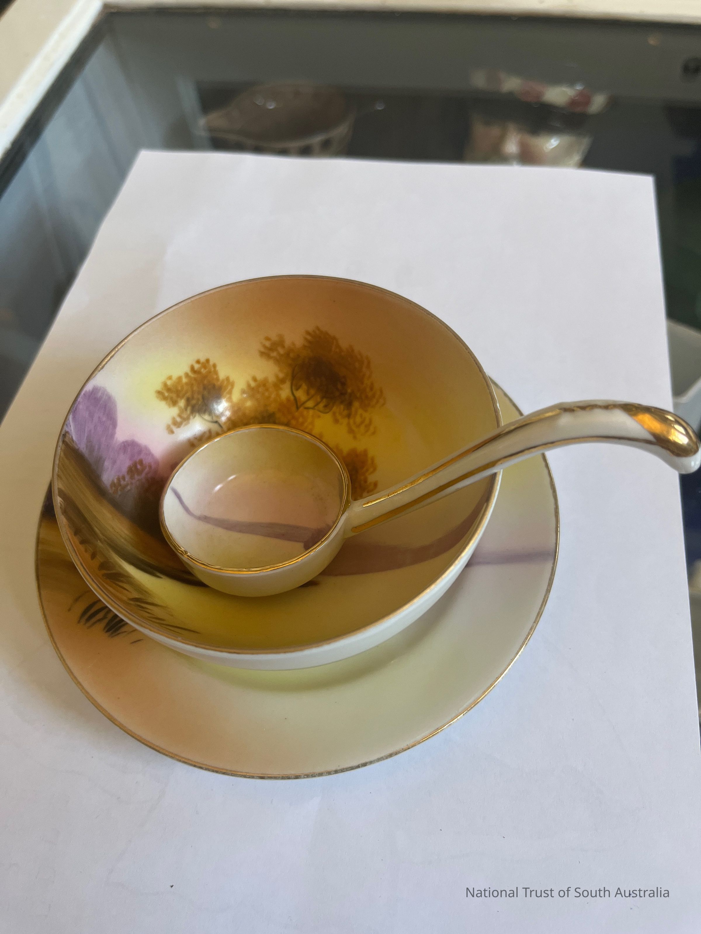 Decorative ceramic cream bowl, plate and ladle set.