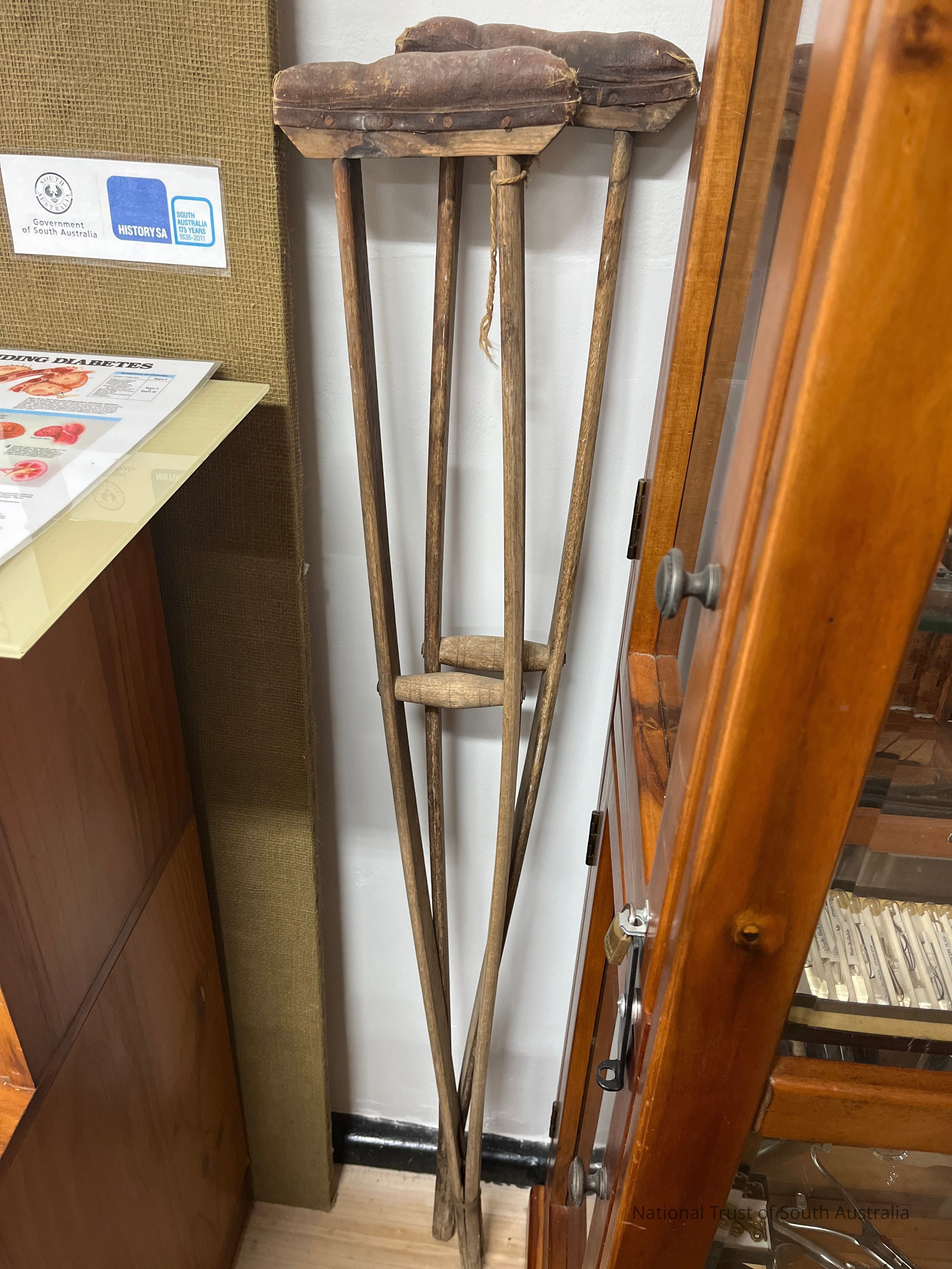 Pair of wooden crutches with leather underarm rests