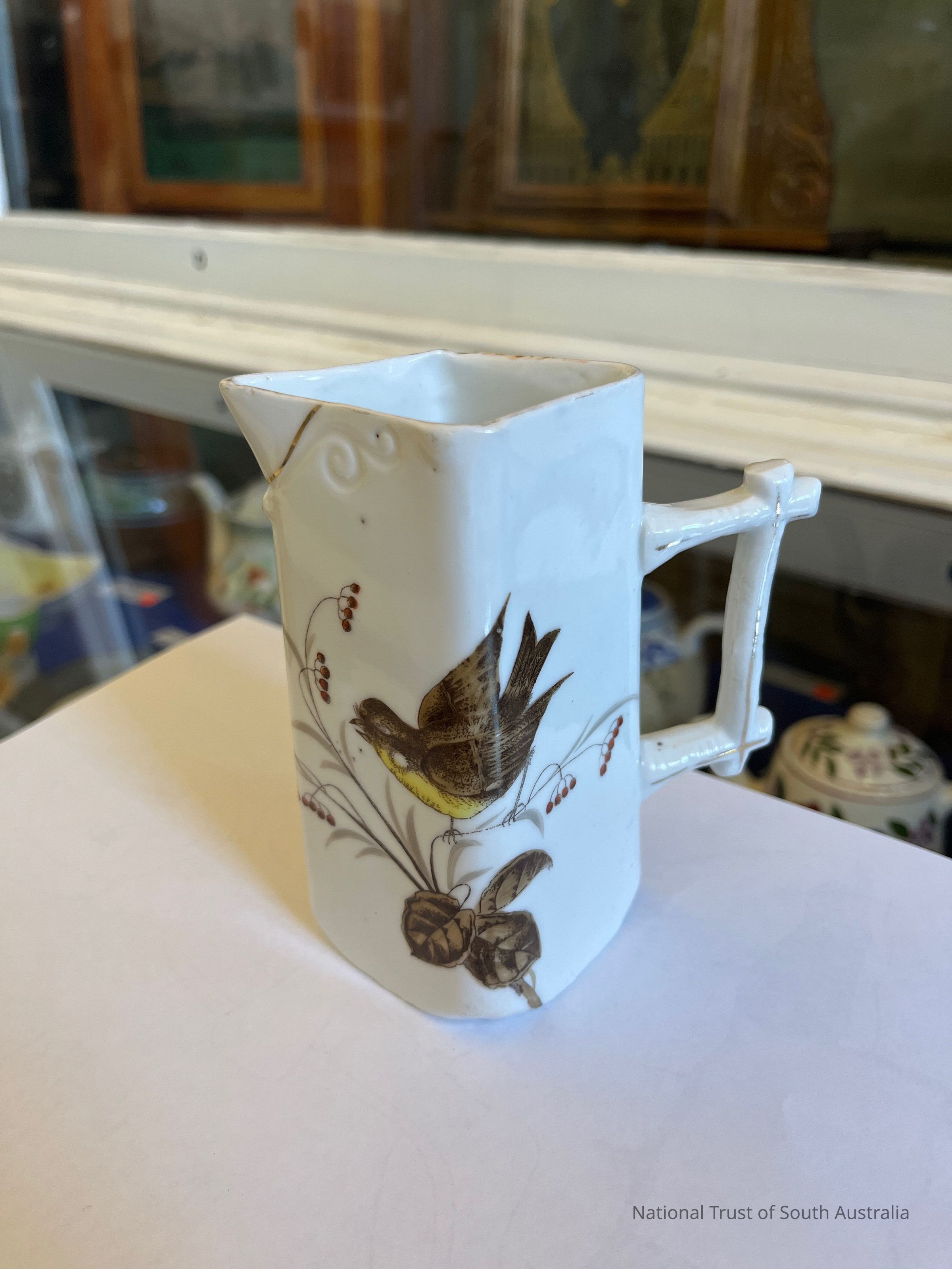 Small square-based jug decorated with a nature-inspired piece featuring a small bird and flora
