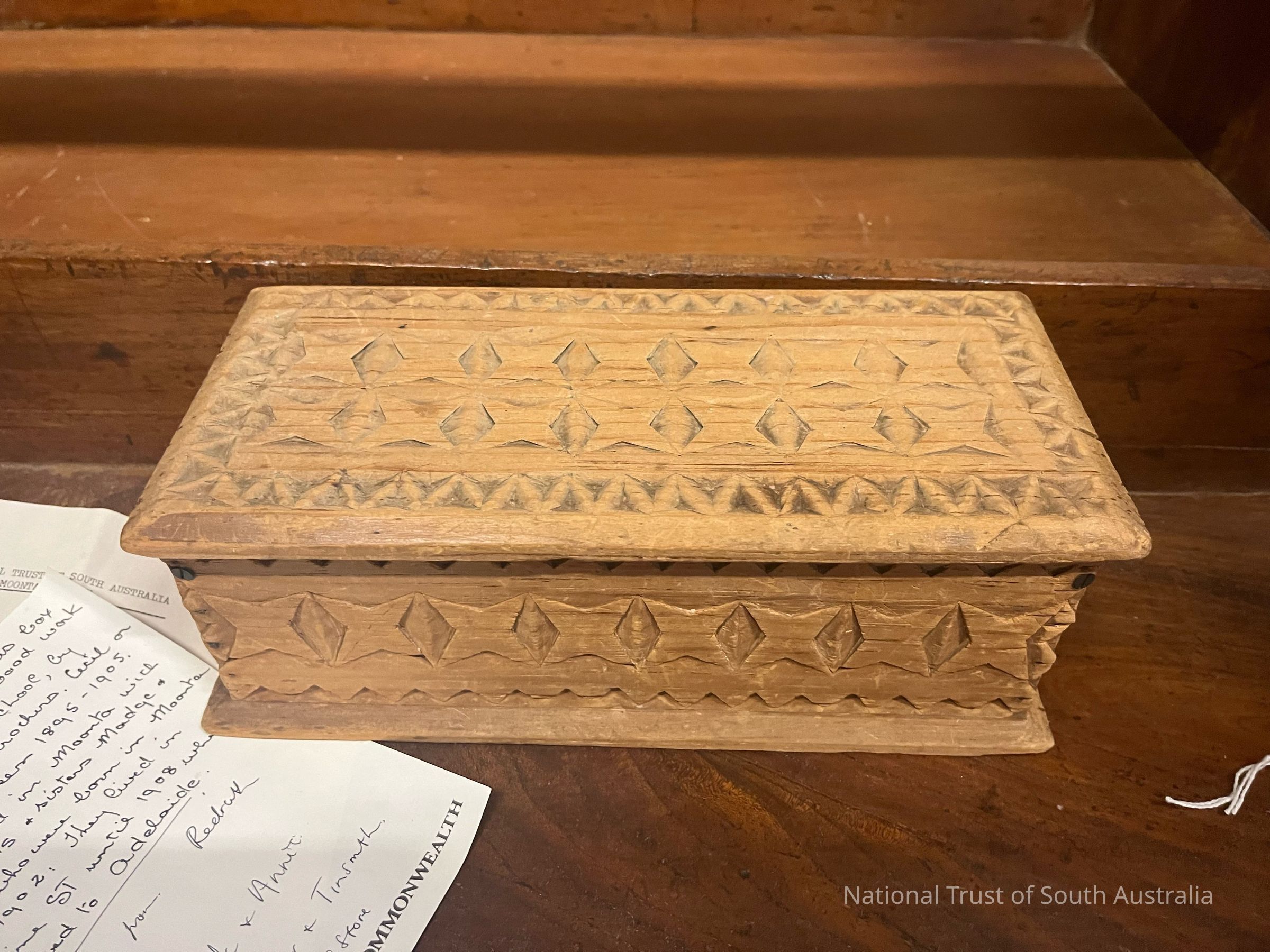This box was made during woodwork classes at a school in Moonta (not specified) by either Cecil or Ken Jewell (brothers). Located in Box K2
