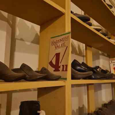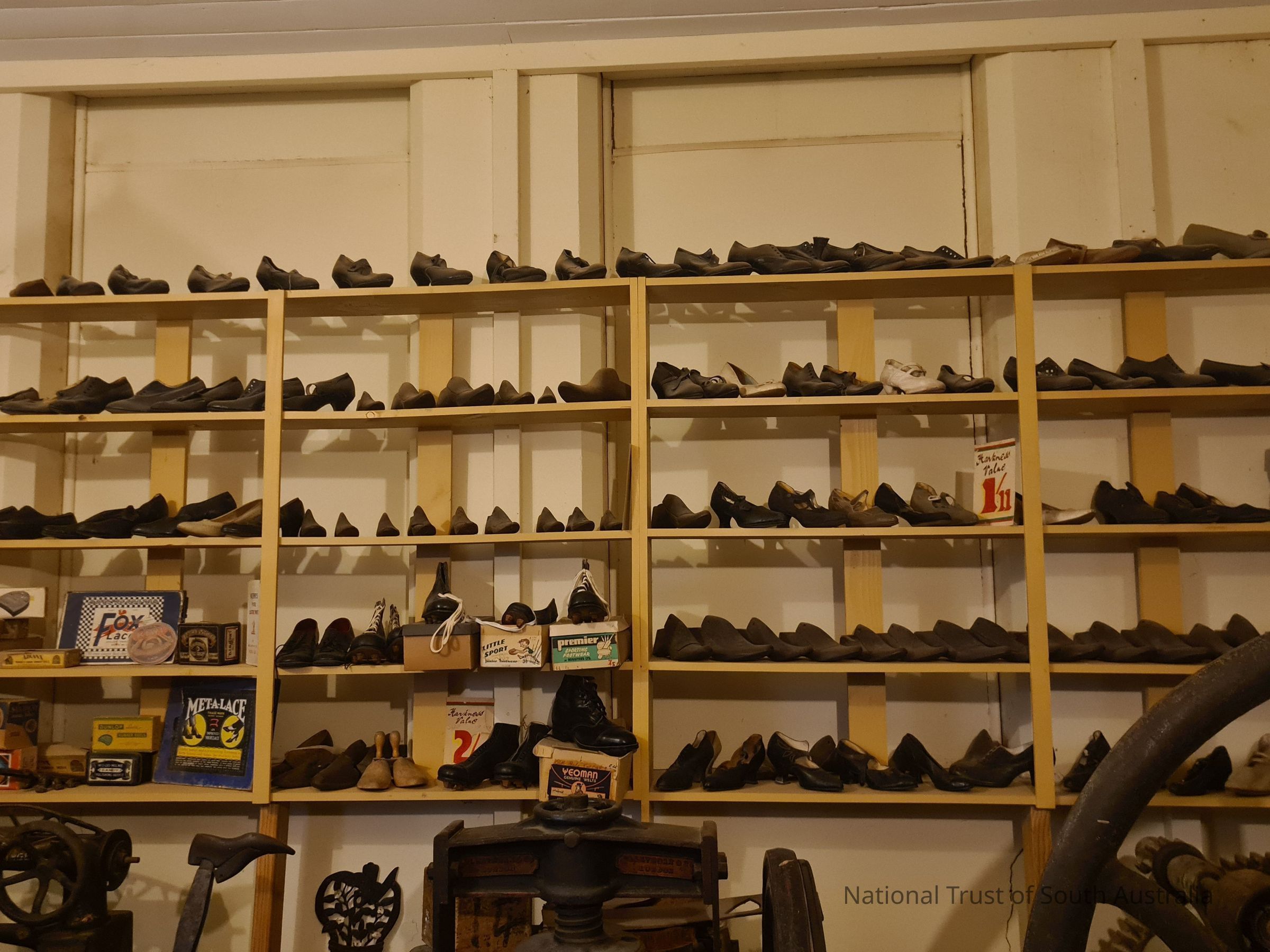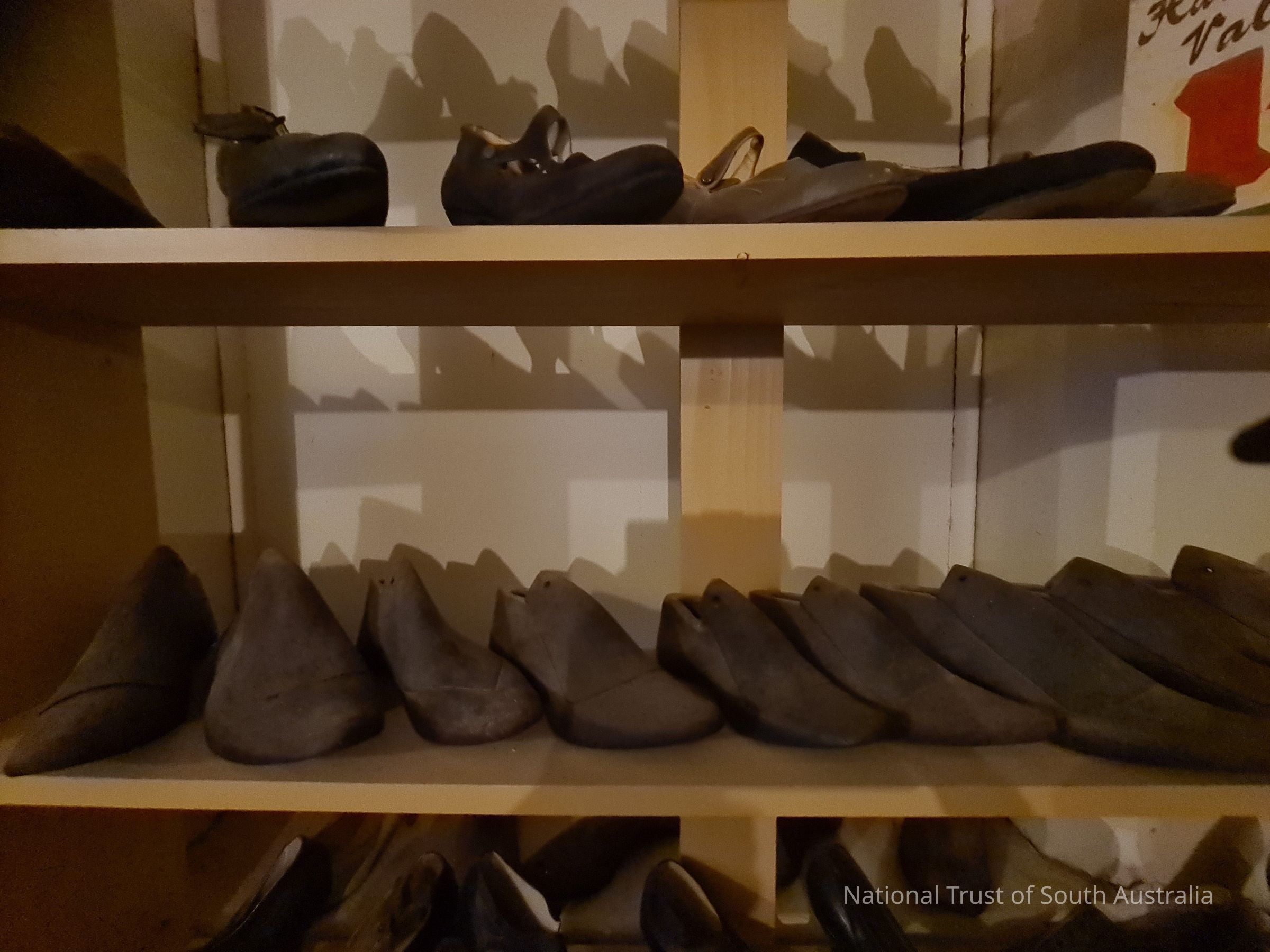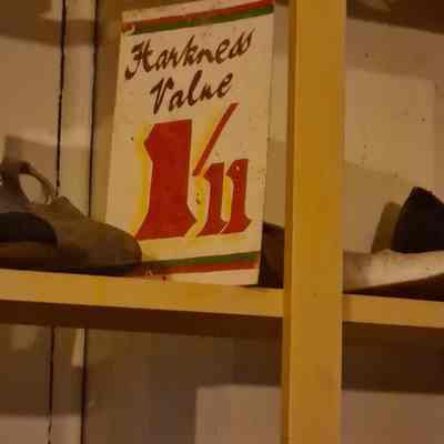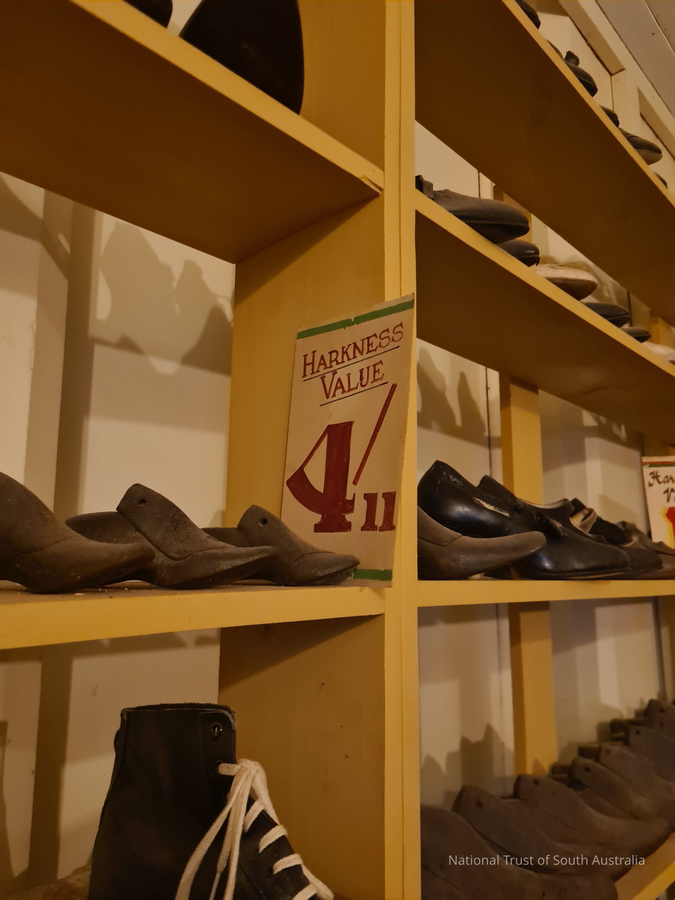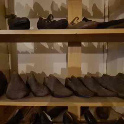Approximately 70 shoes set up like a shoe shop display. With sales signs. Includes a selection of shoe moulds of different sizes and boxes.Collection