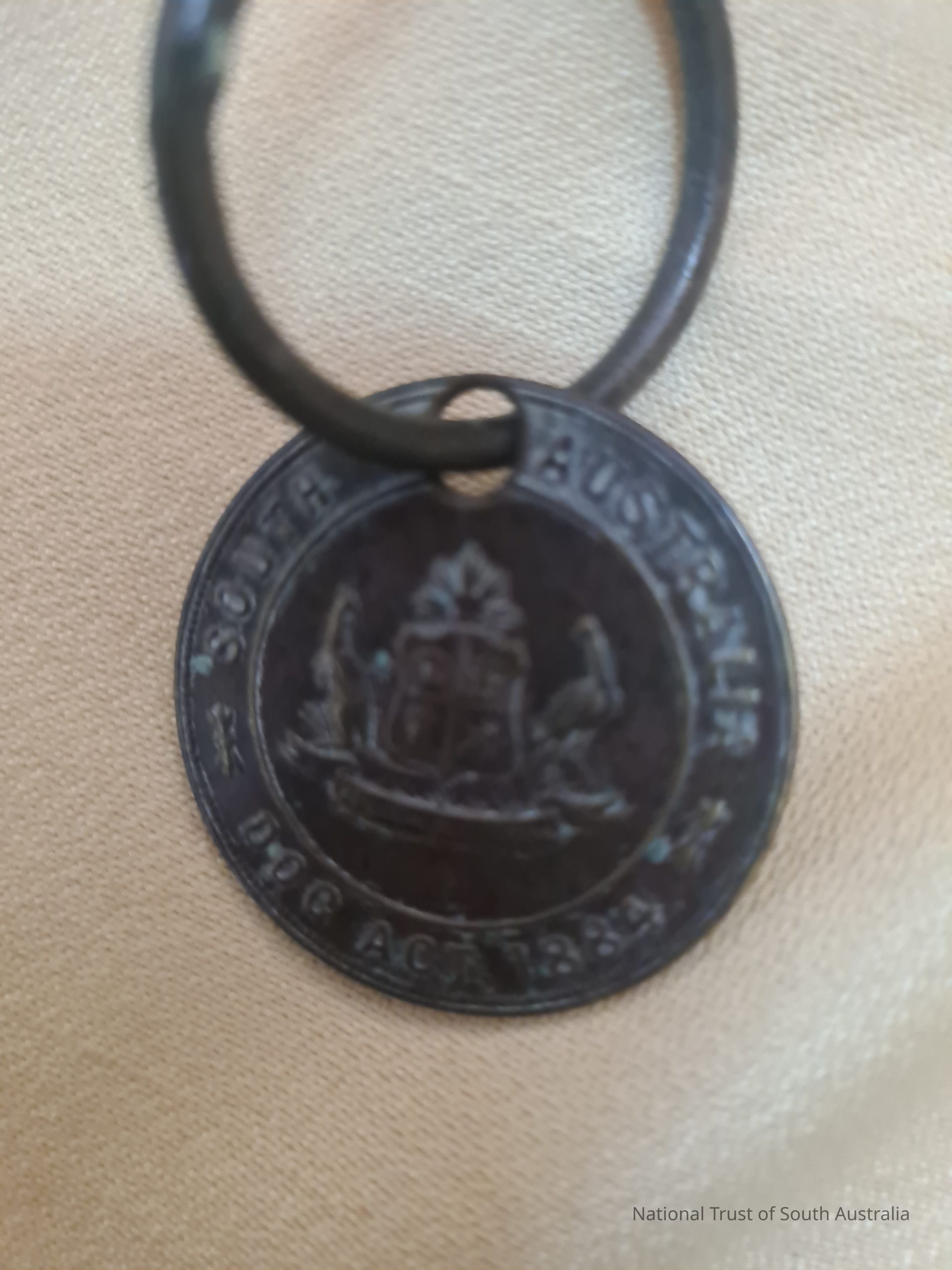 Dog Registration Medal. Donated by Mr. E. J. Thomas. South Australian Dog Registration Act 1884. Tag reads Reg.No. 16 Dustrict 27. Medal registers said dog to 30 June 1886Collection