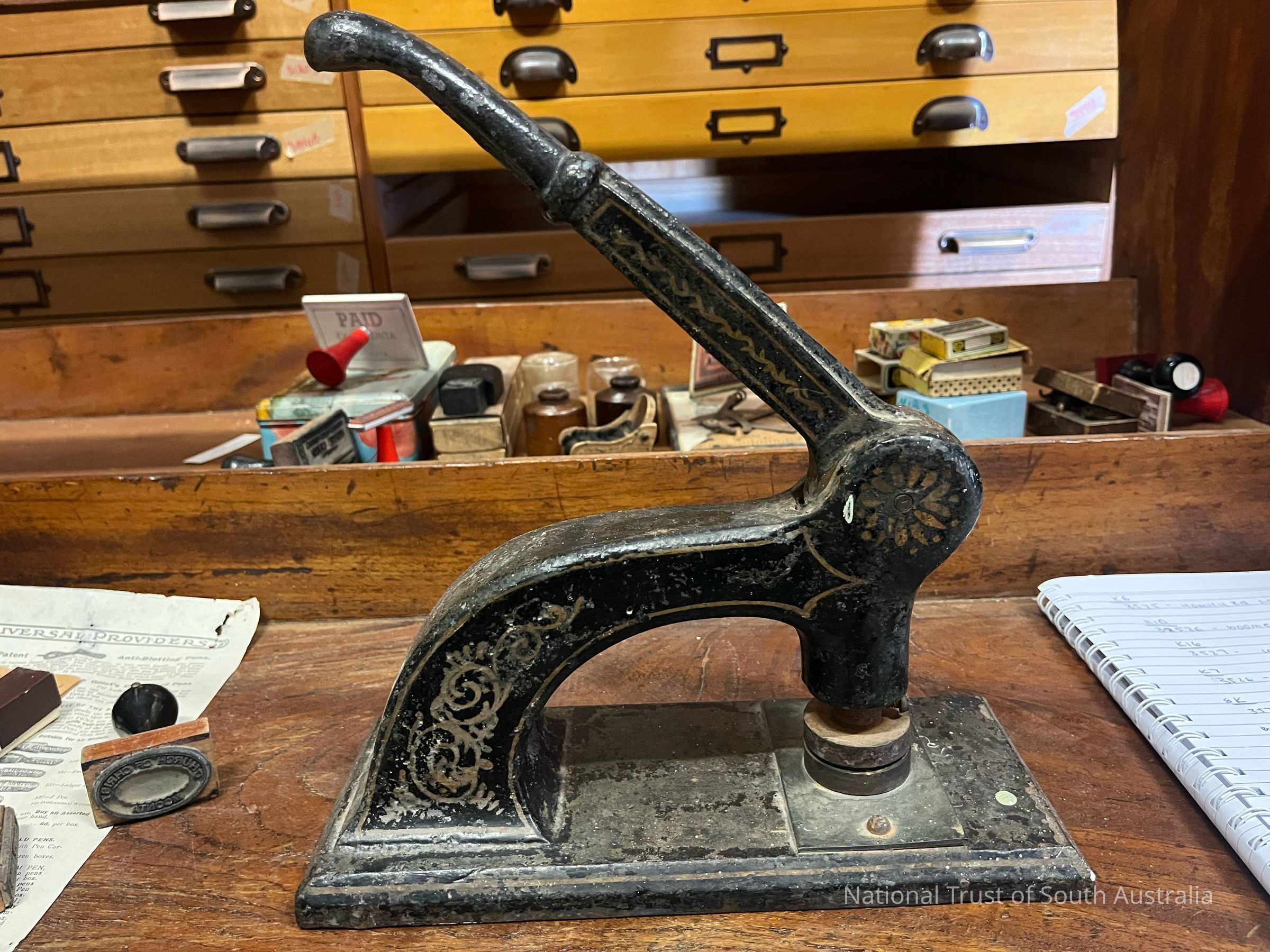 Black embosser with gold details. Stamp press arm has been screwed shut. Located Box 15K