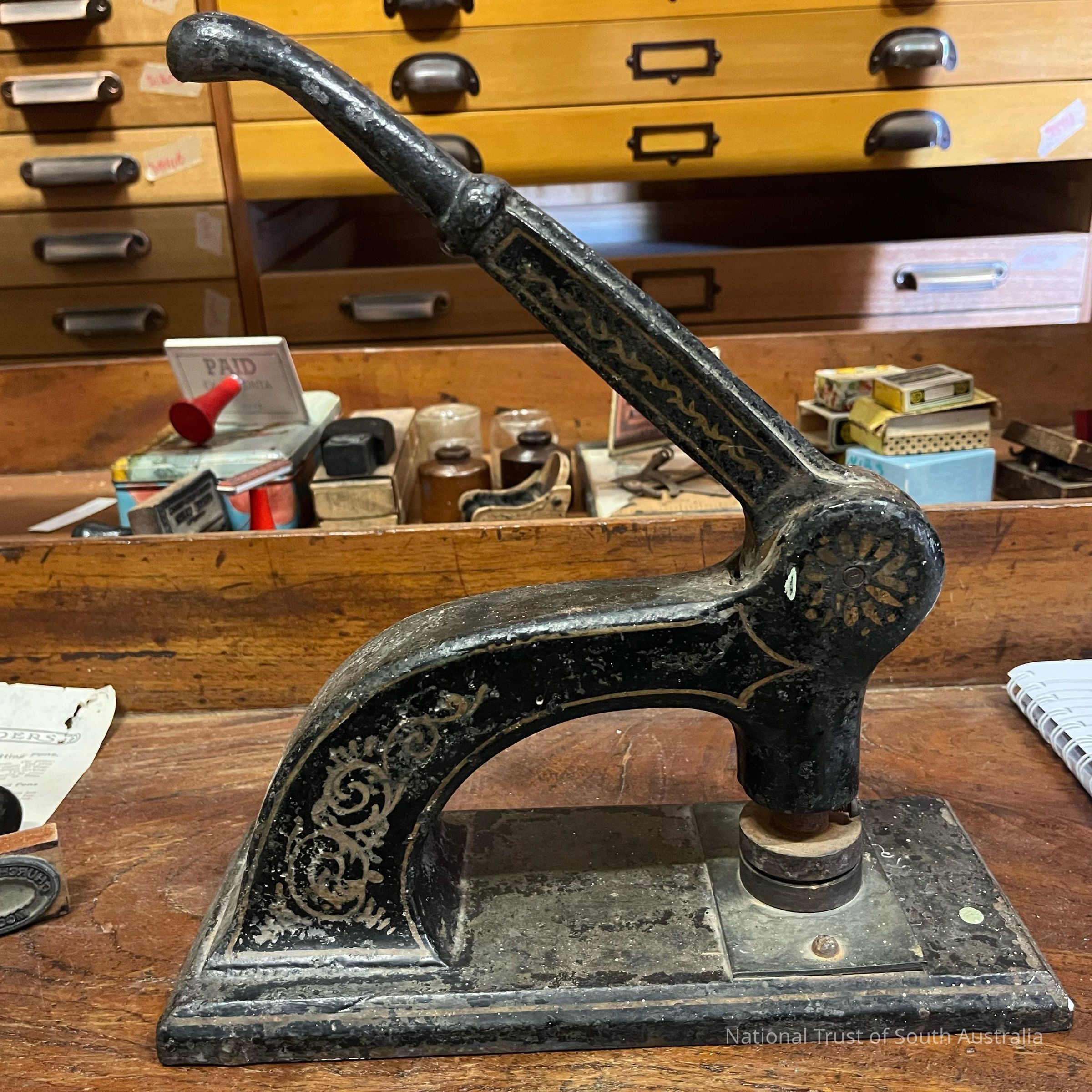 Black embosser with gold details. Stamp press arm has been screwed shut. Located Box 15K