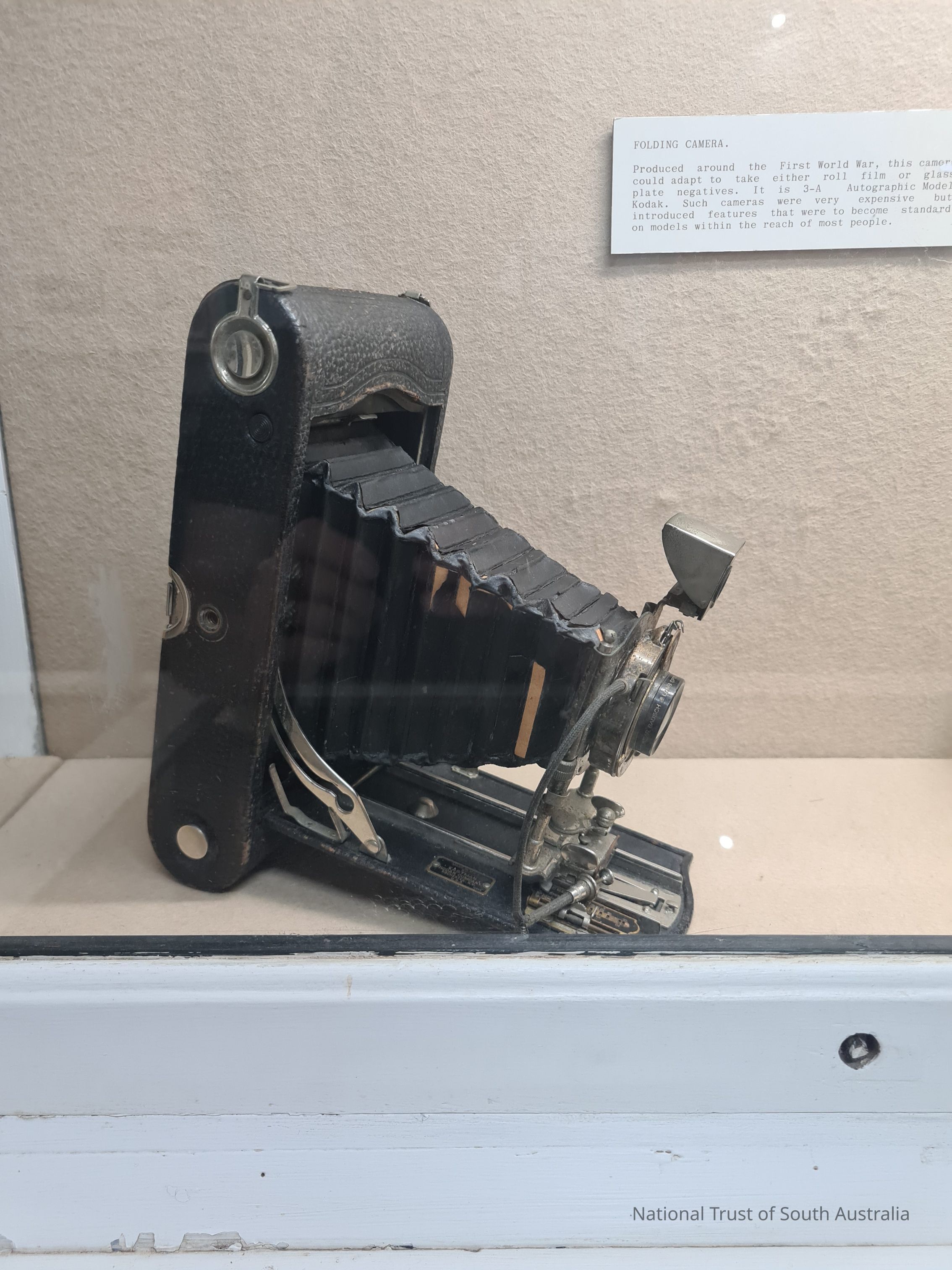 Produced around the time of the First World War this camera could adapt to take either roll film or glass plate negatives.It is a 3-A Autographic Model Kodak.Collection