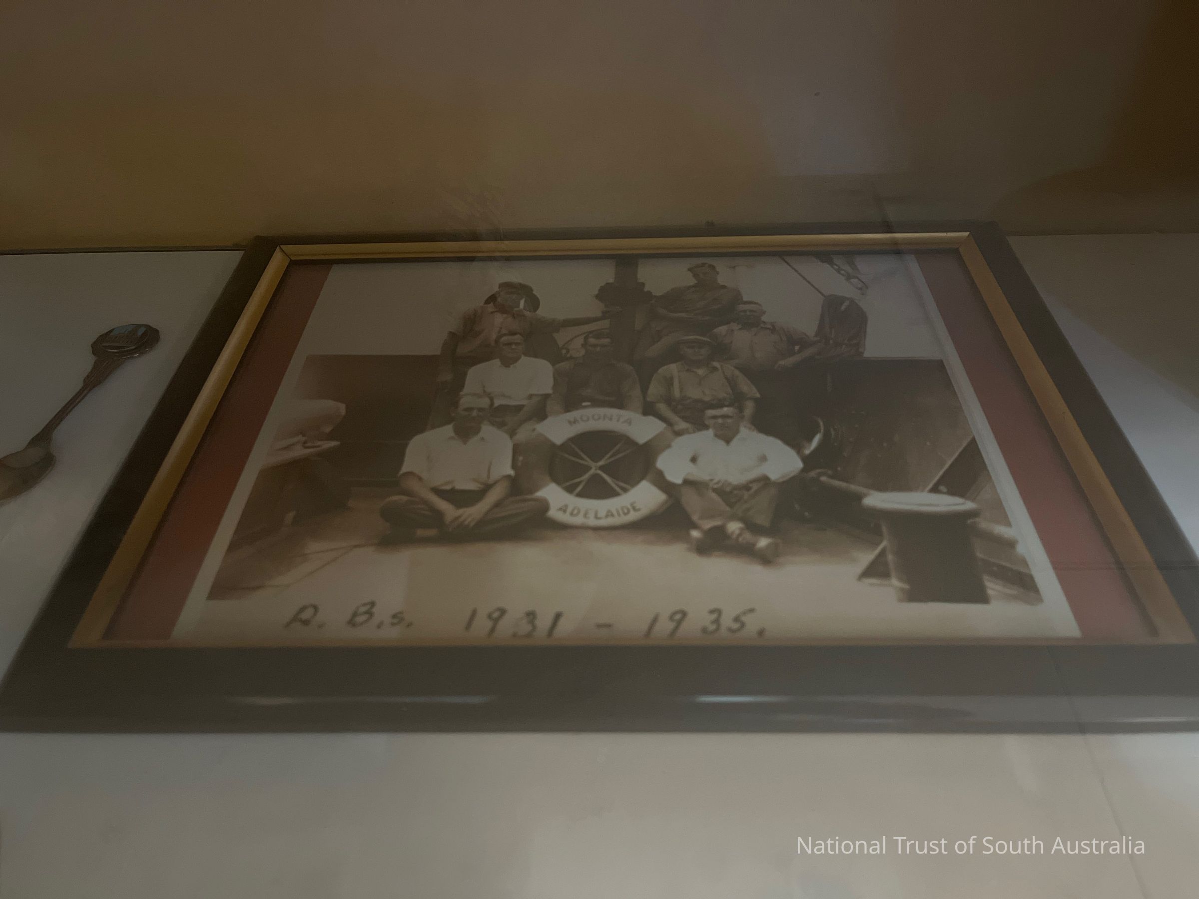 Framed photograph of men aboard a ship, posed about a life ring with the words “Moonta Adelaide”.