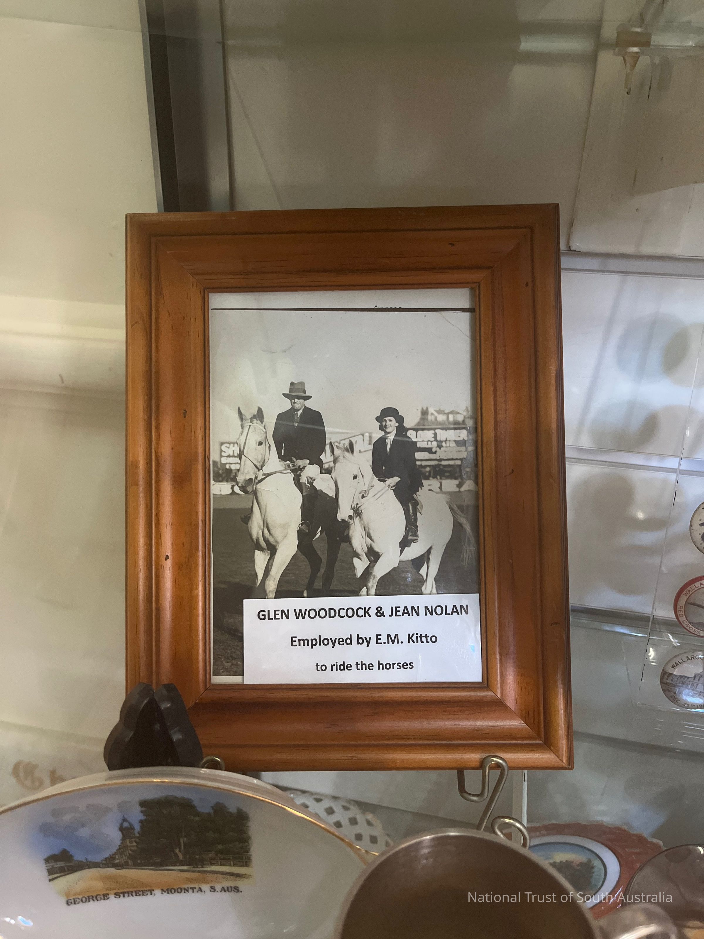Framed photograph of Glen Woodcock and Jean Nolan who were both employed by EM Kitto to ride the horses