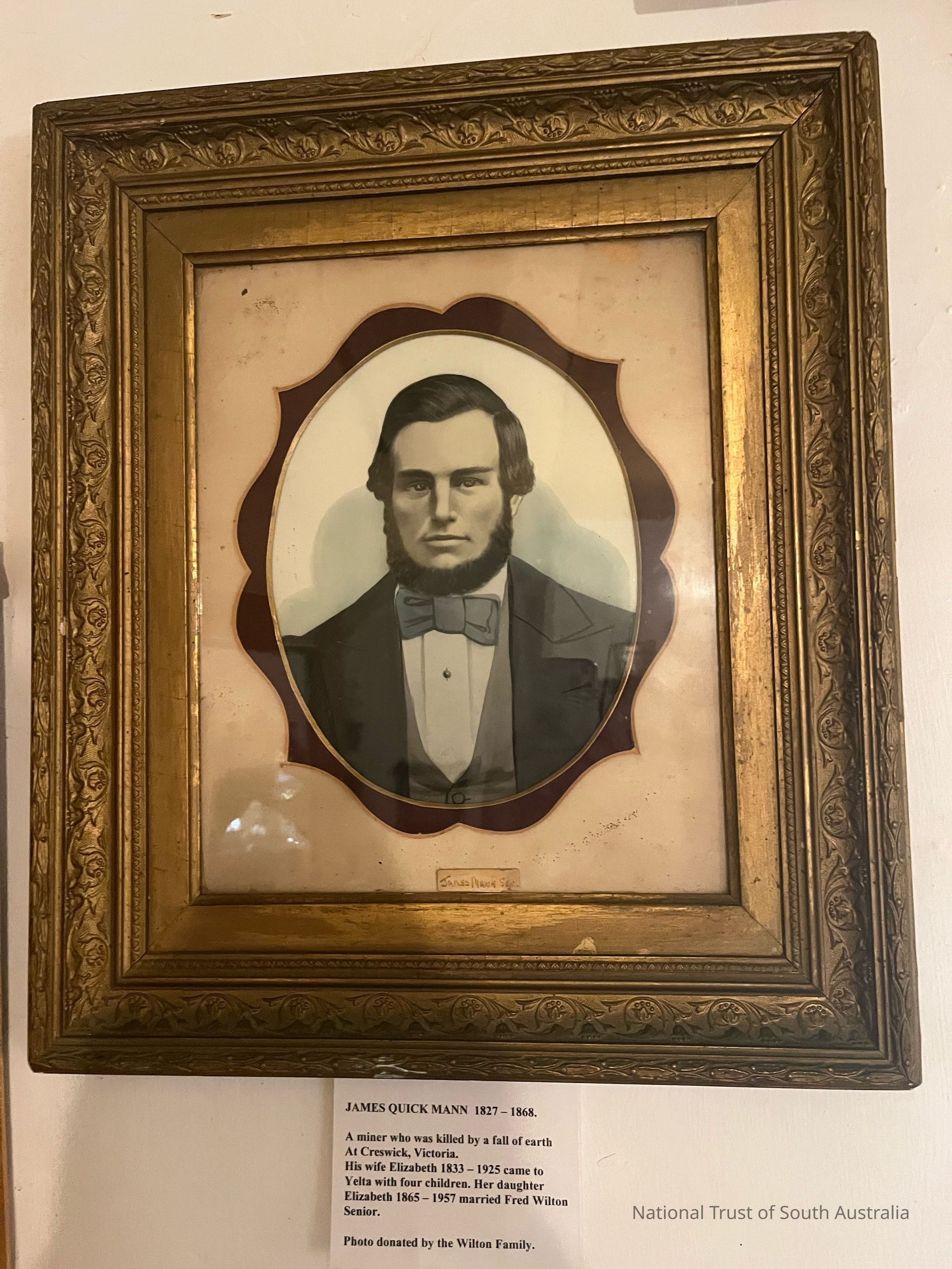 Framed portrait of James Quick Mann (1827-1868). James was a miner who was killed at Creswick, Victoria. His widow Elizabeth (1833-1925) relocated to Yelta with their four children. Their daughter Elizabeth (1865-1957) married Fred Wilton Sr.Collection