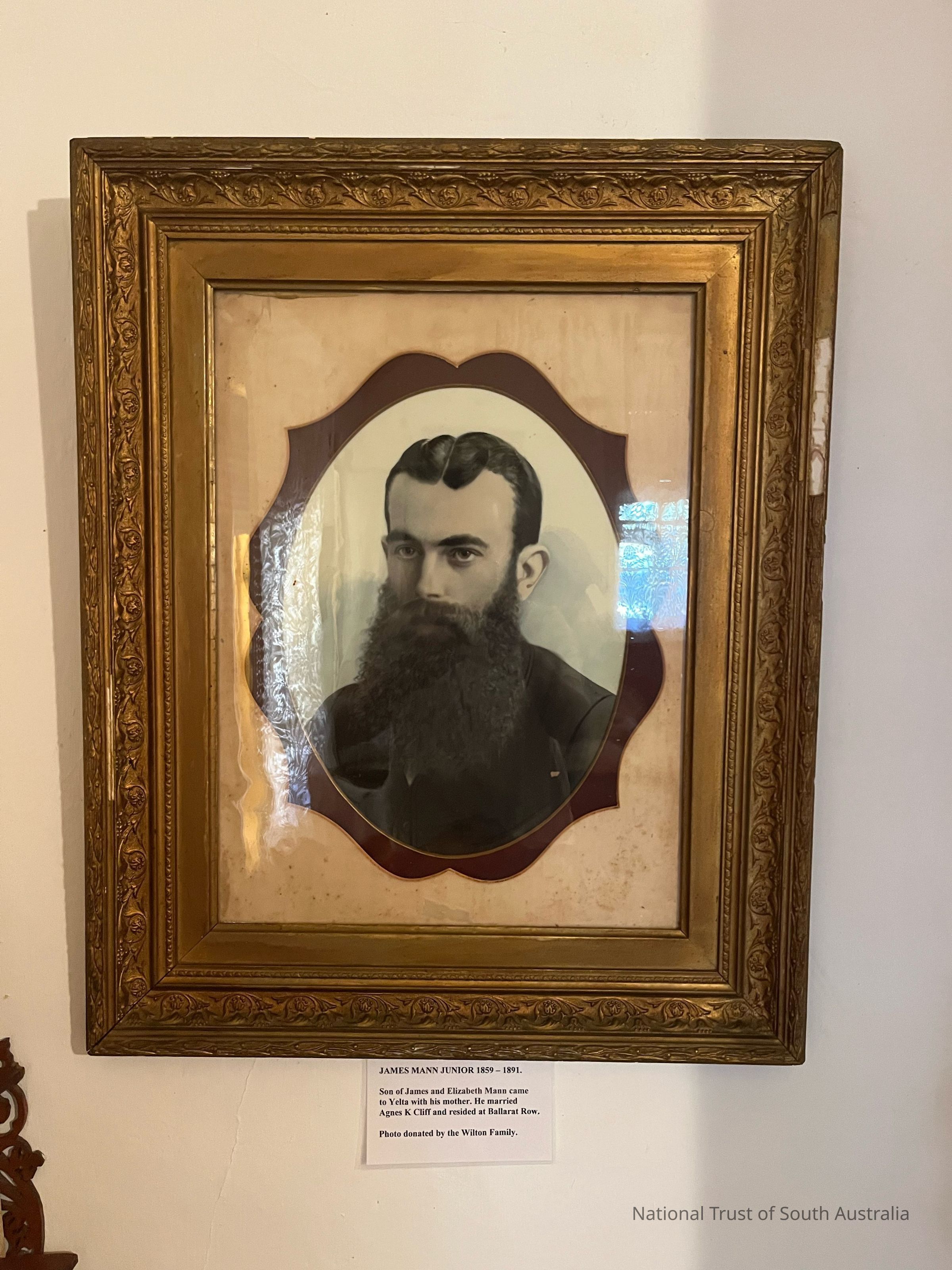 Framed portrait of James Mann Junior (1859-1891). Son of James and Elizabeth Mann. Came to Moonta with his mother after his father’s death. Married Agnes K Cliff and lived at Ballarat Row.Collection