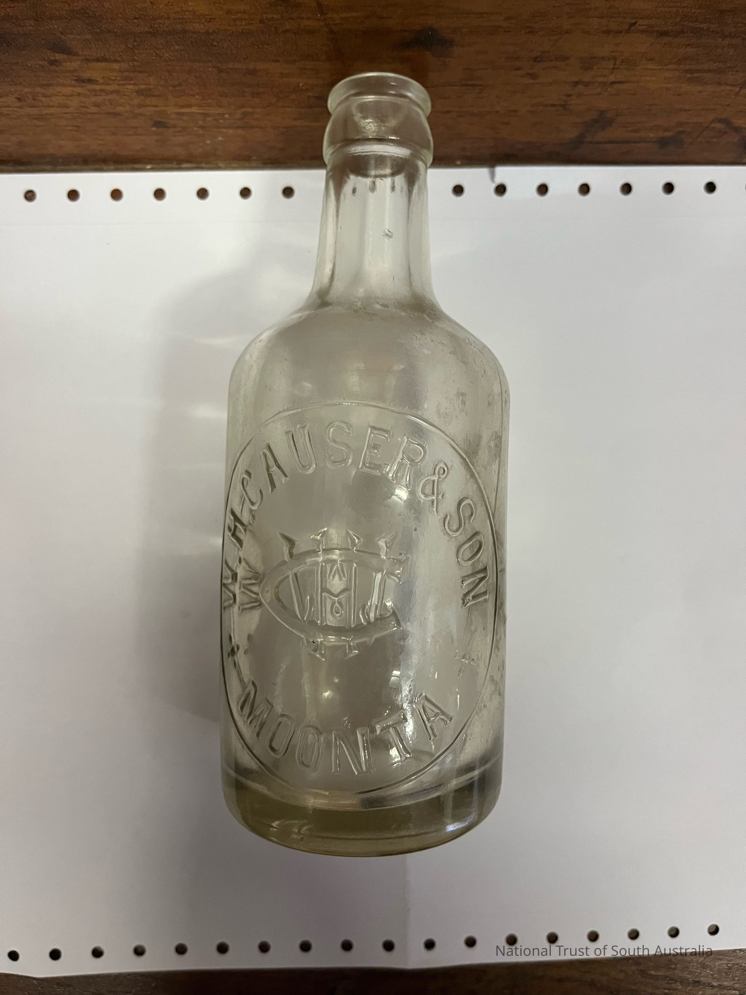 Glass bottle. Words embossed: WH Causer & Son Moonta. Located Box 9K
