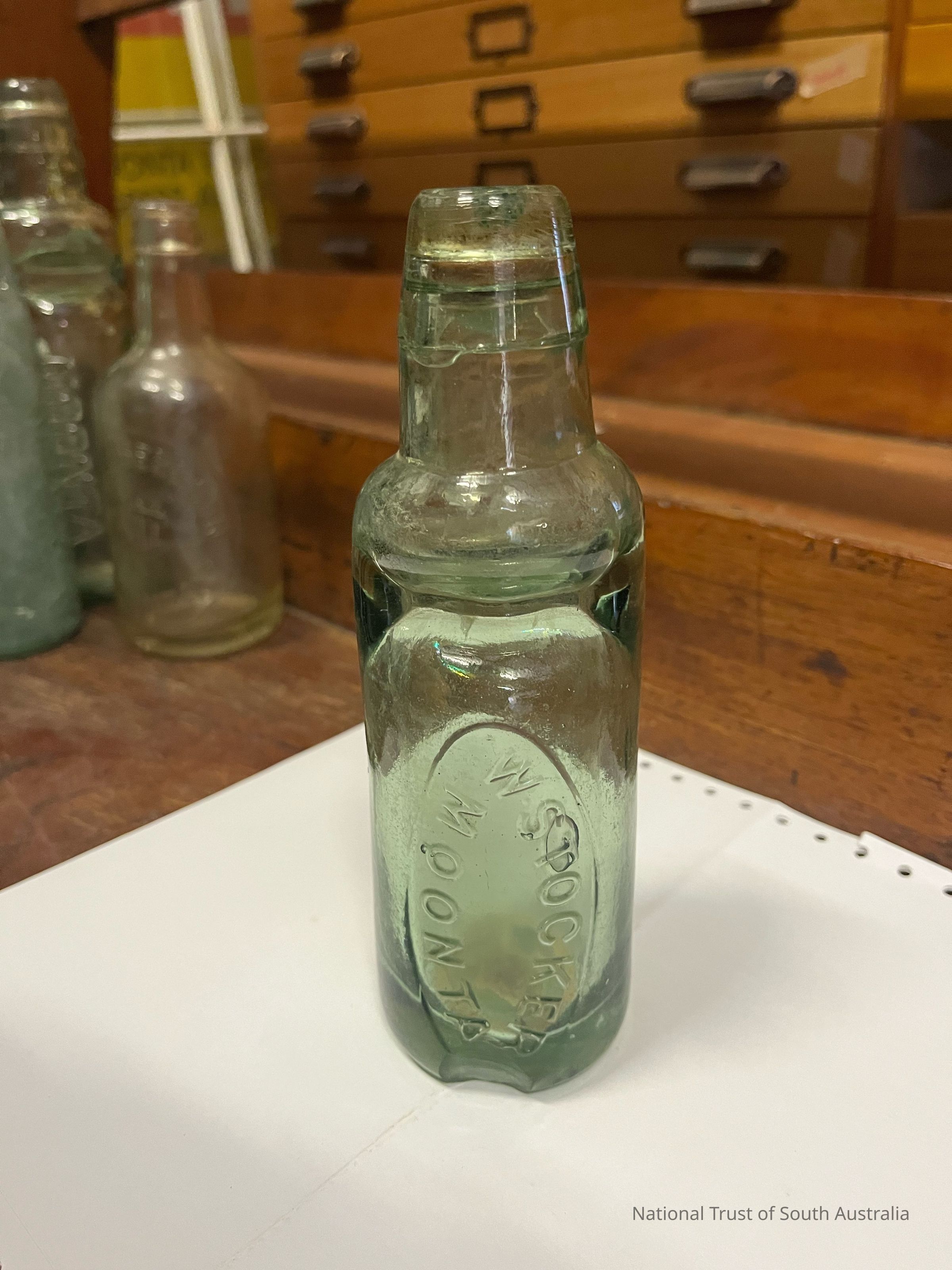 Glass bottle full of liquid. Embossed with: W STOCKER MOONTA. Located Box 9K