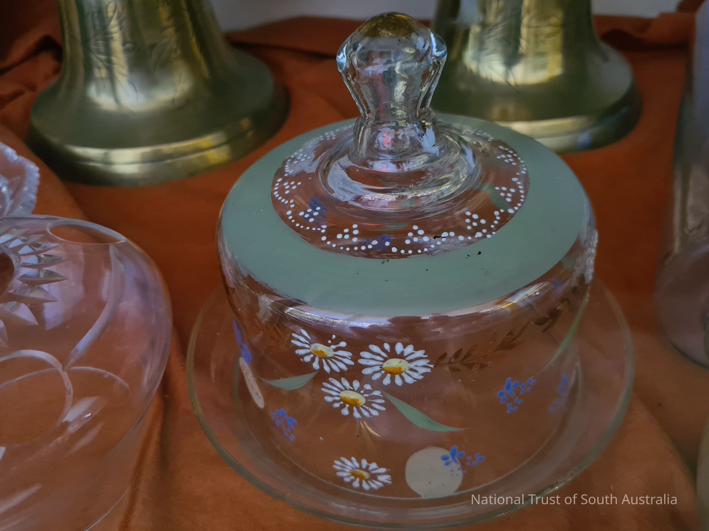 Glass Butter Dish with floral design. Donated by S.A. Coombe
