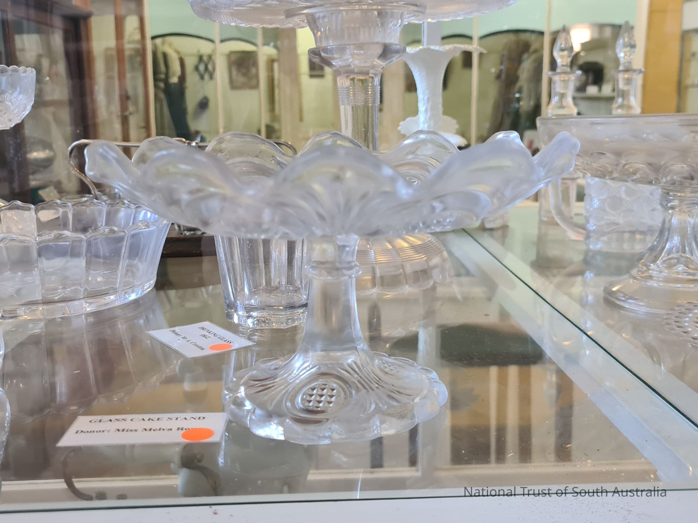 Glass cake stand donated by Elva Rowe