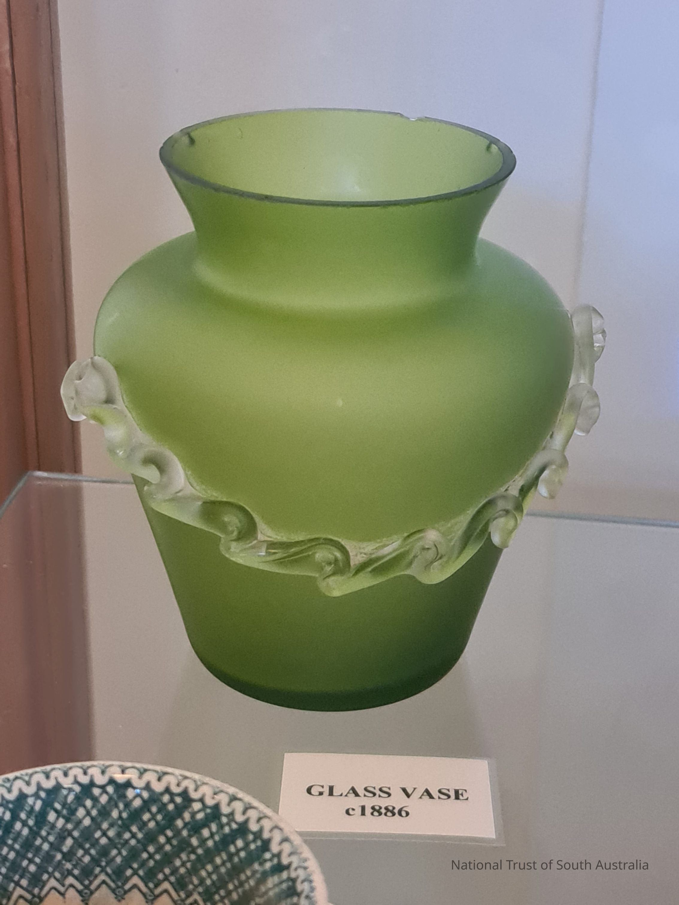 Green glass vase. Clear glass frill around centre. Circa 1886.