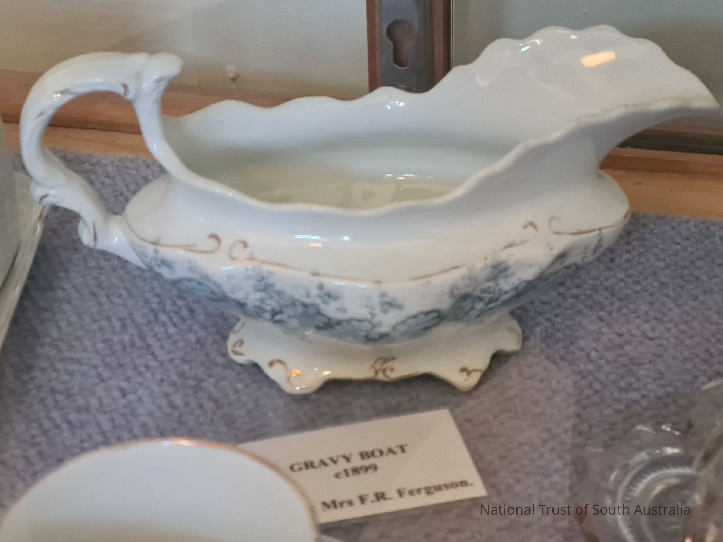 White with blue floral decoration. Circa 1899. Donated by Mrs F. R. Ferguson