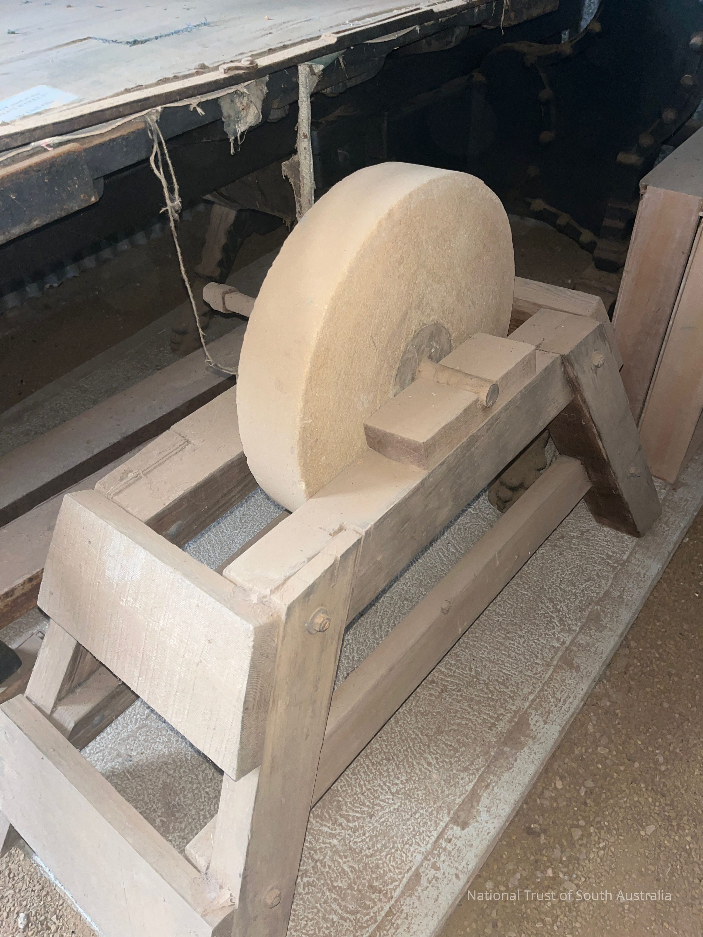 Grinding stone with lever on wooden bench