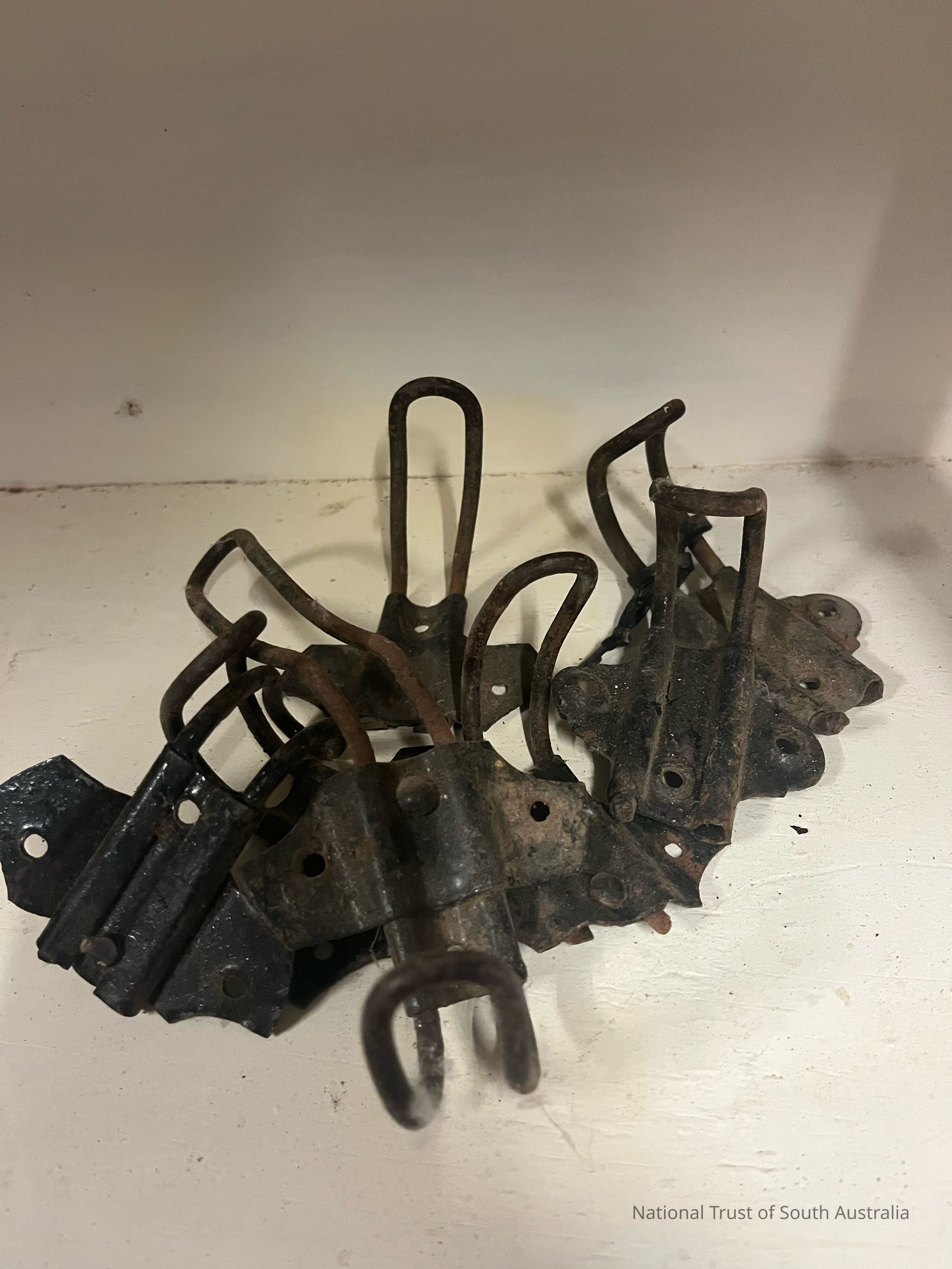 Set of seven hooks, possibly from school coat rack
