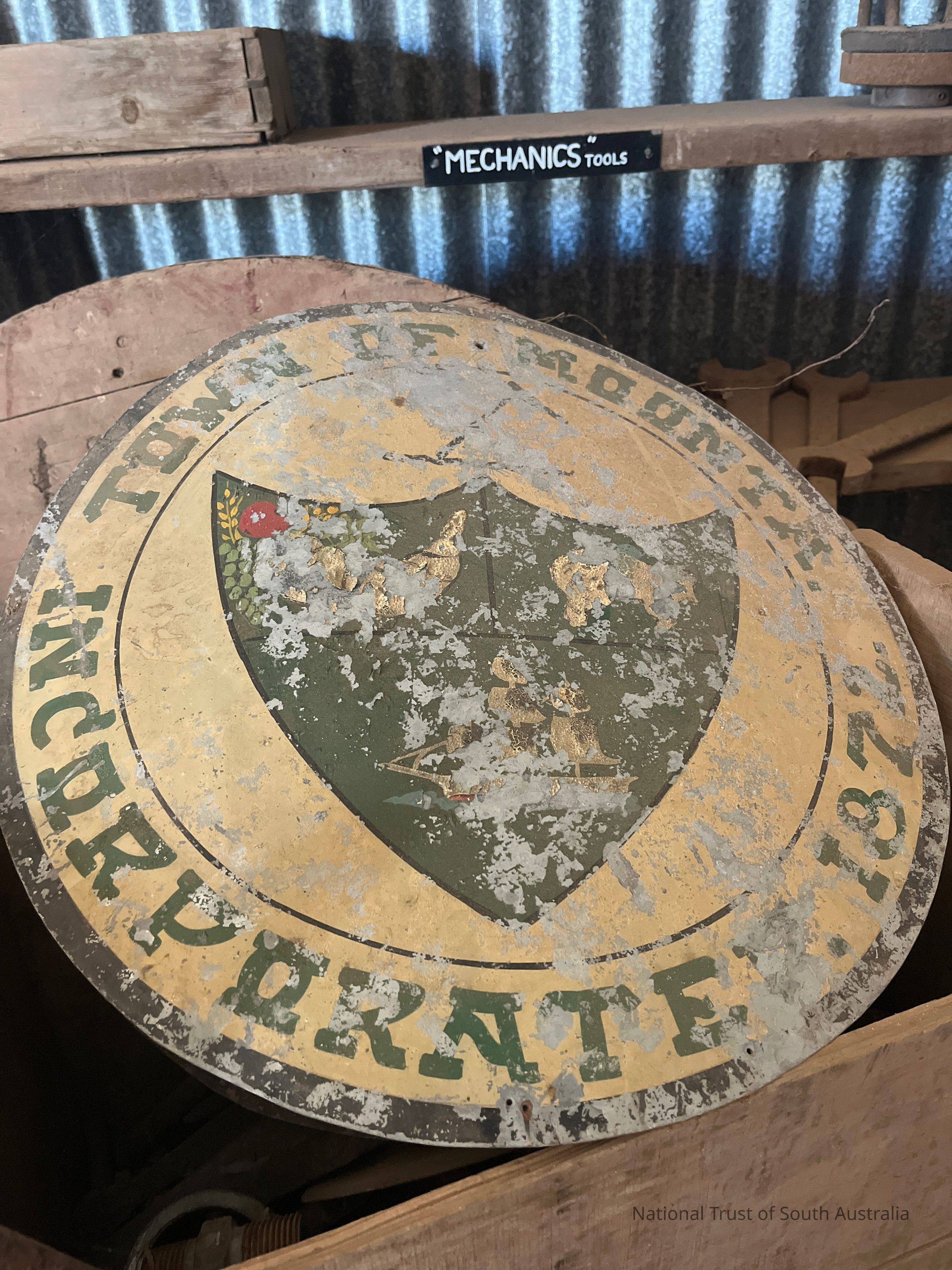 Two tin shields. Text: TOWN OF MOONTA INCORPORATED 1872