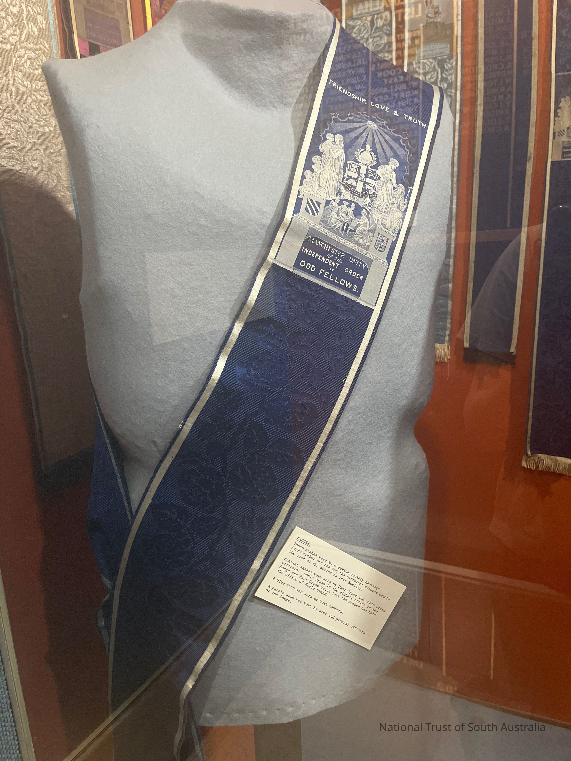 Blue sash of the Manchester Unity of the Independent Order of Oddfellows. This sash was worn by most members.