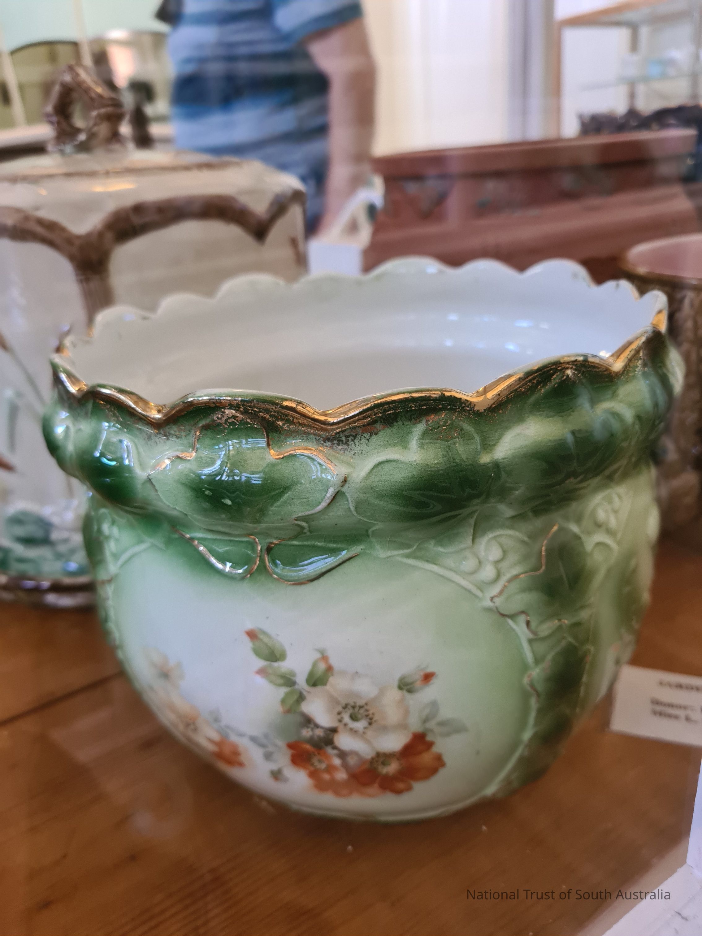 Green Jardiniere with floral design. Donated from estate of Miss L. Curnow