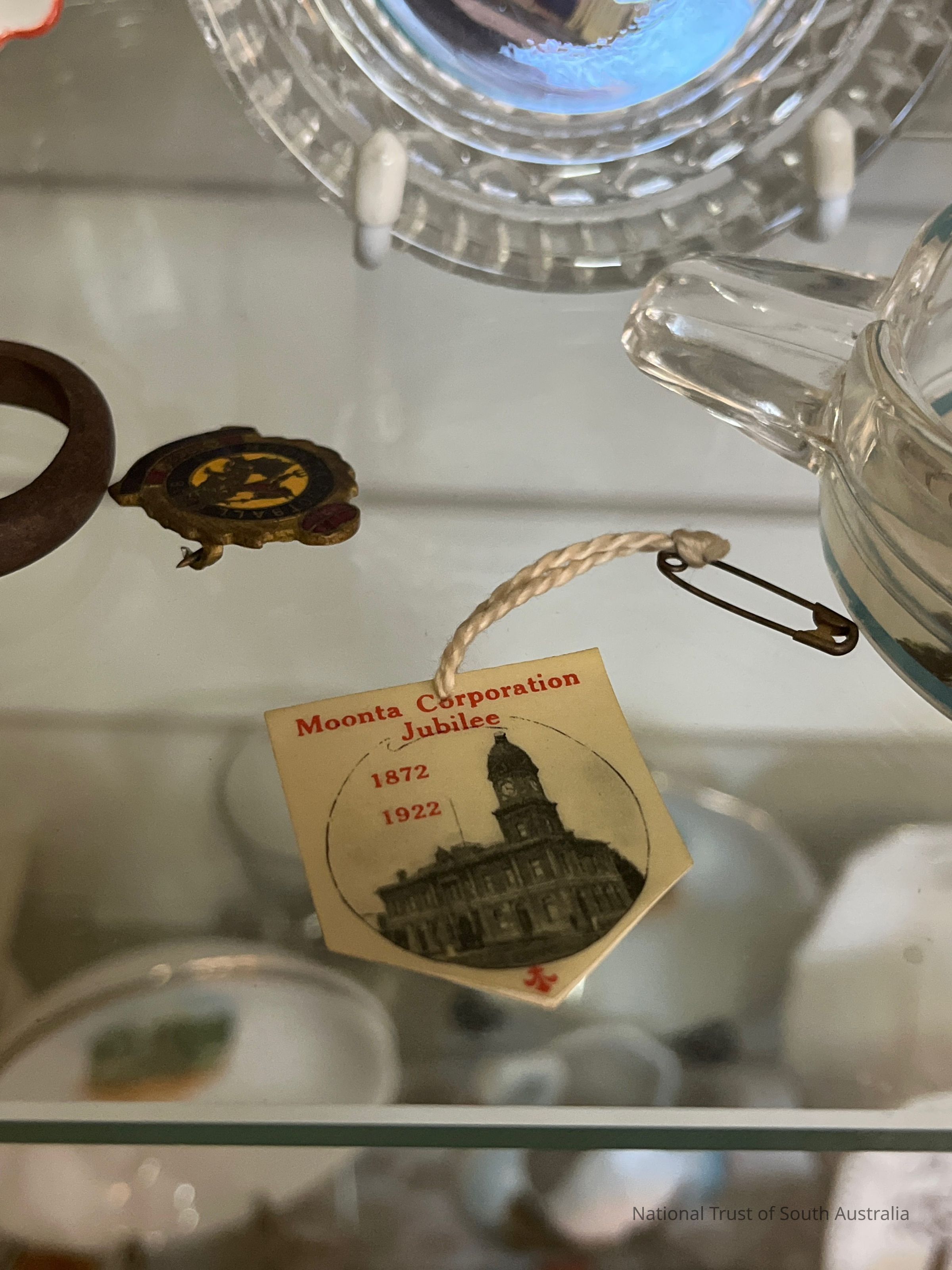 Small tag attached to safety pin. Ribbon features an image of the town hall and the words: Moonta Corporation Jubilee 1872 1922