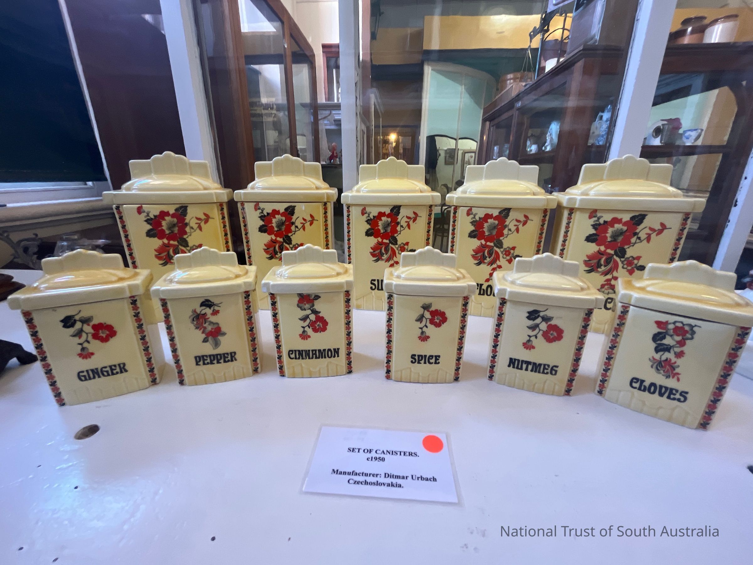 Set of 11 kitchen canisters used for sugar, oatmeal, sago, flour, rice, ginger, pepper, cinnamon, spice, nutmeg and cloves