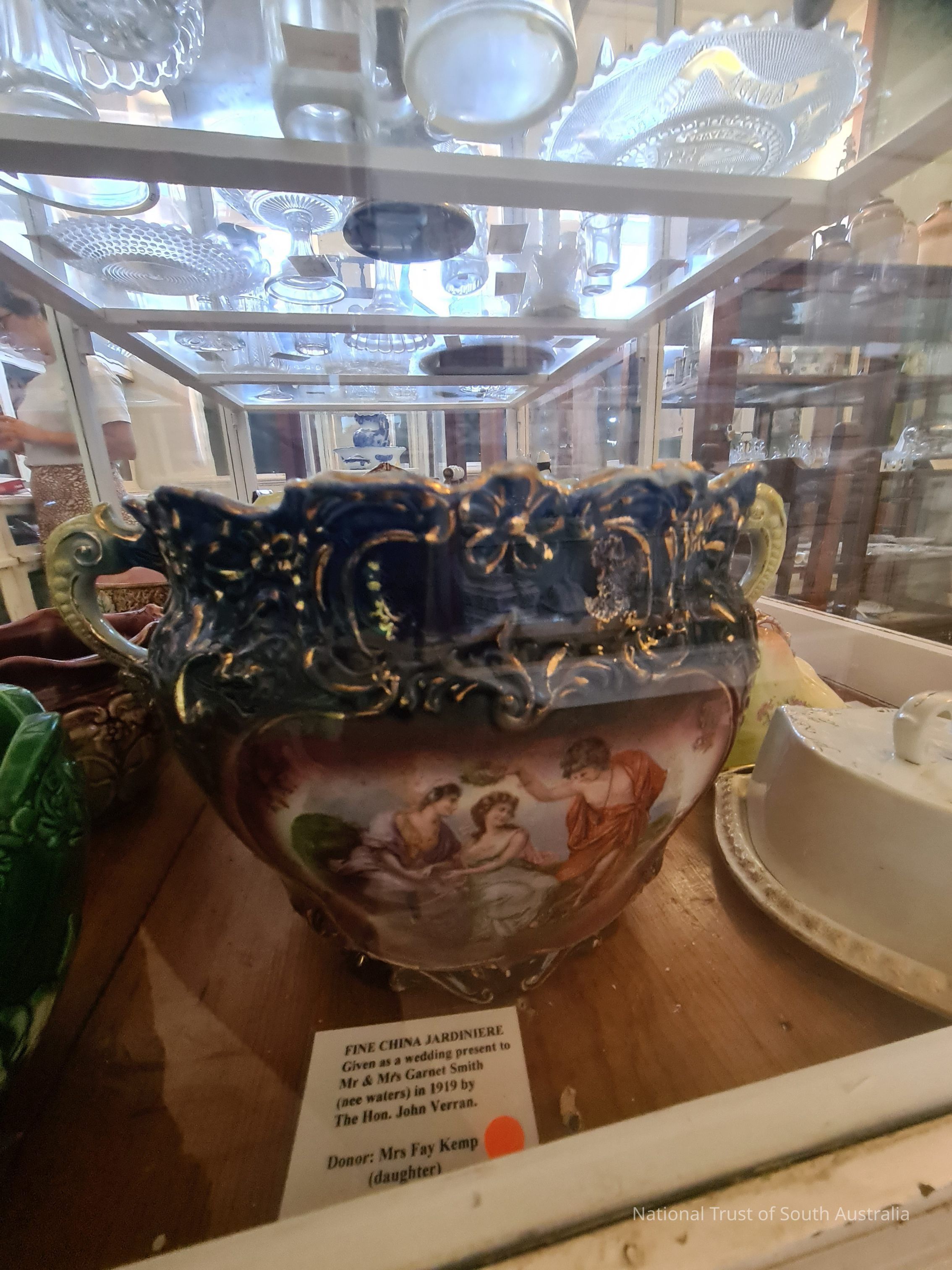 Large Navy blue jardiniere made os fine China. Given as a wedding present to Mr and Mrs Garnet Smith nee Waters in 1919 by Hon. J. Verran. Donated by their daughter Faye Kemp.Collection