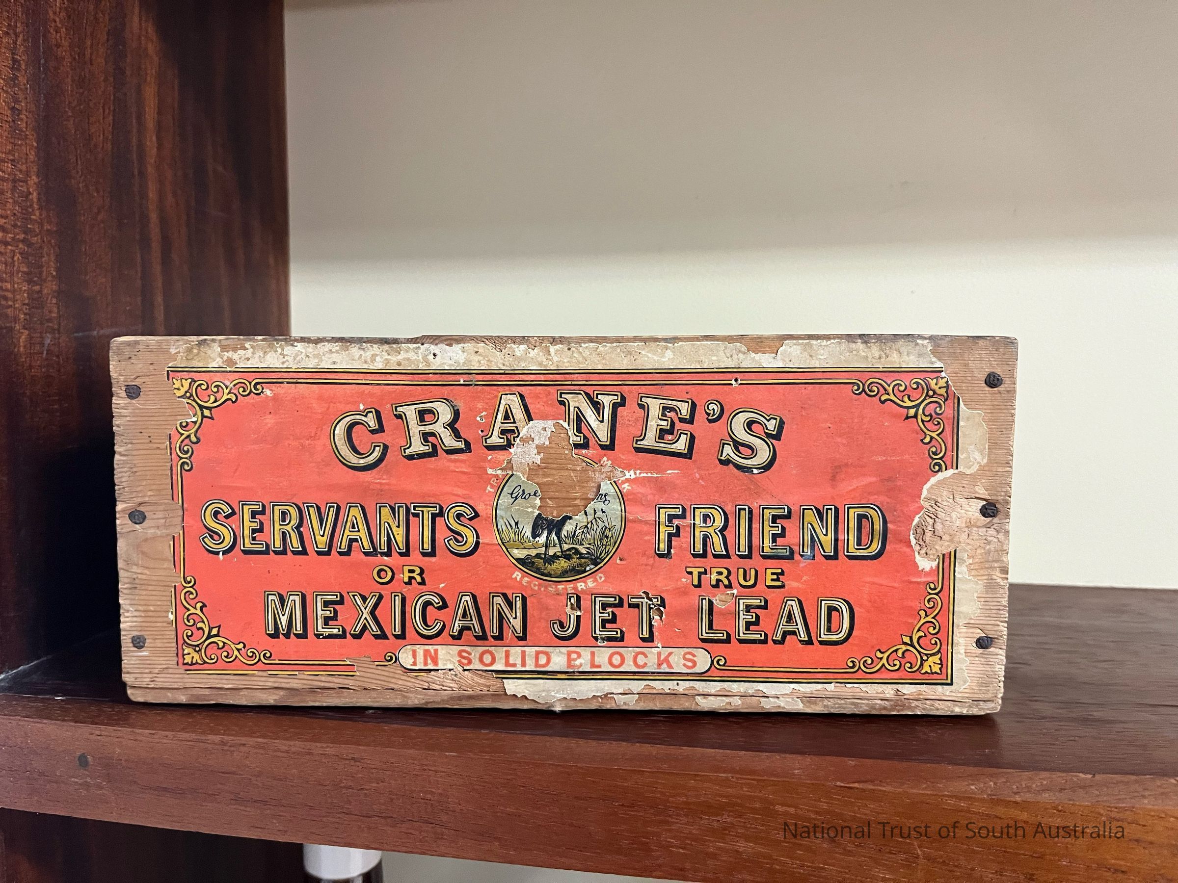 Wooden box with no lid and fading label. Label reads: Crane’s Servants Friend or true Mexican Jet Lead in solid blocks