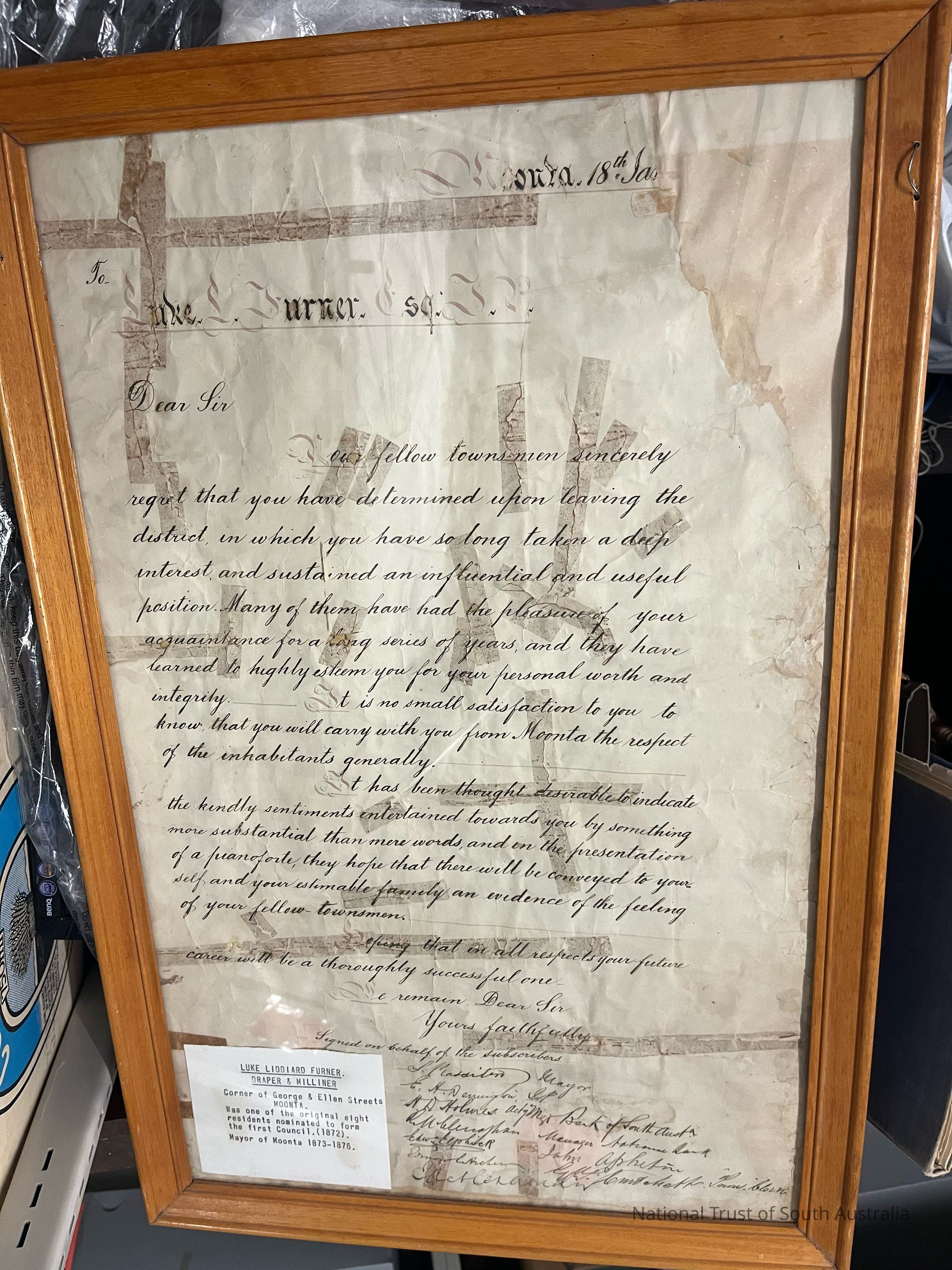 Framed letter of appreciation given to Luke Liddiard Furner, local Draper and milliner, by other businessmen when he left the district