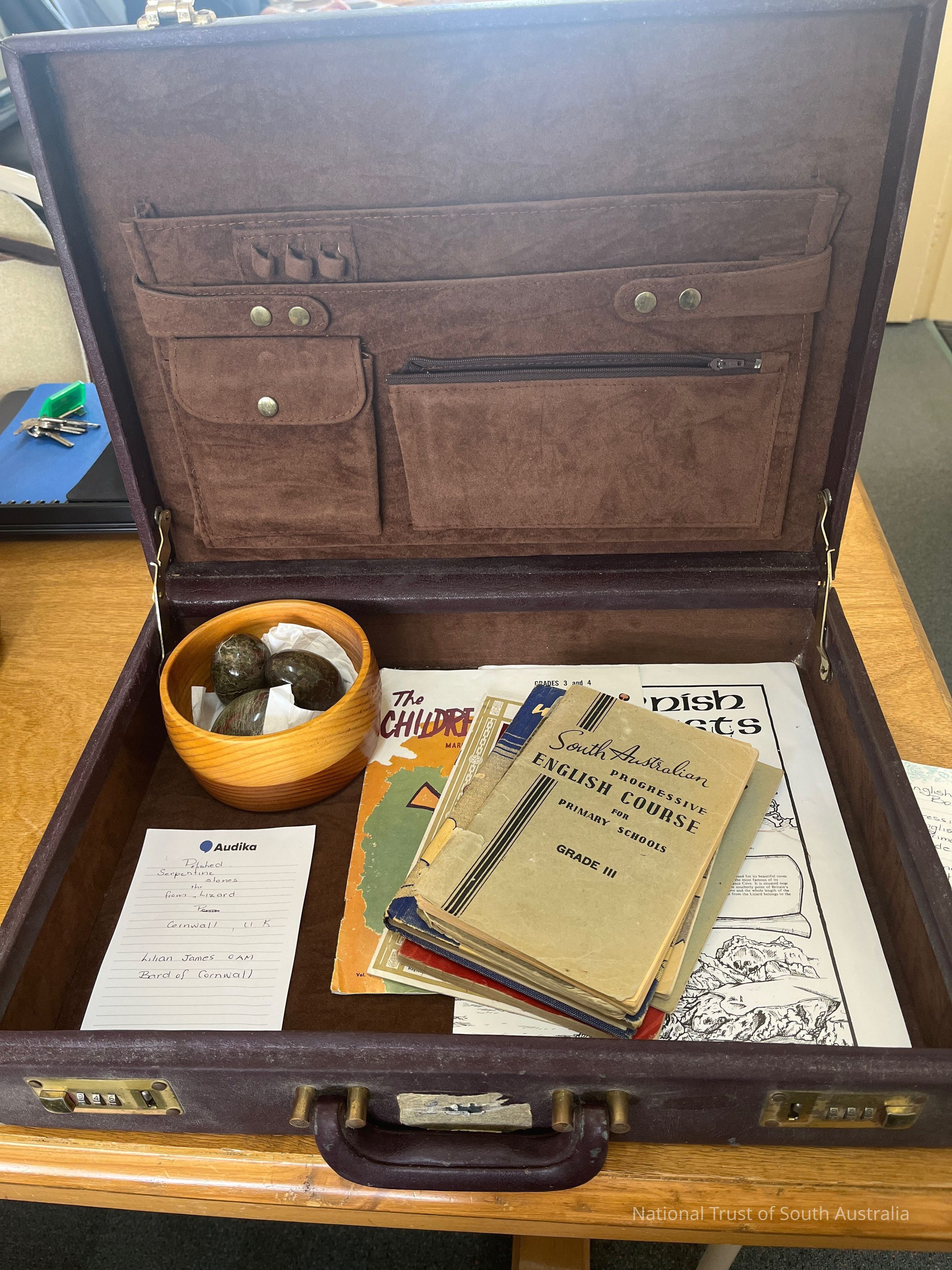 Includes: three polished serpentine stones, a bag of marbles, the Cornish Coasts map, two editions of the Children’s Hour, a Cornish dice, two editions of the Pathfinder Arithmetic Book, a Wide Range Reader blue block, Grade III SA progressive English course for primary schools and the Manual of Domestic Art (cookery) book.Collection