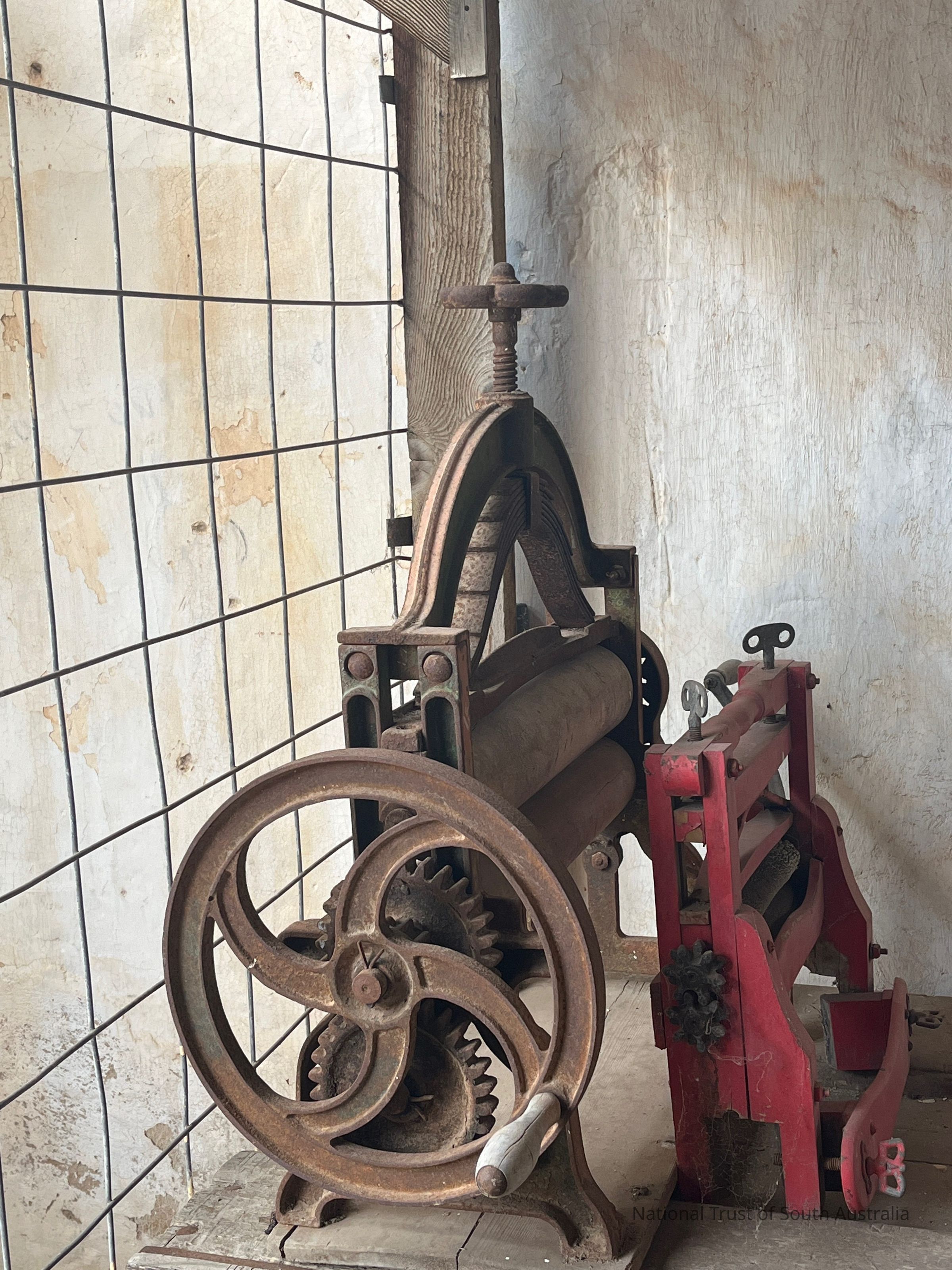 Large rusted mangle with two wooden rollers