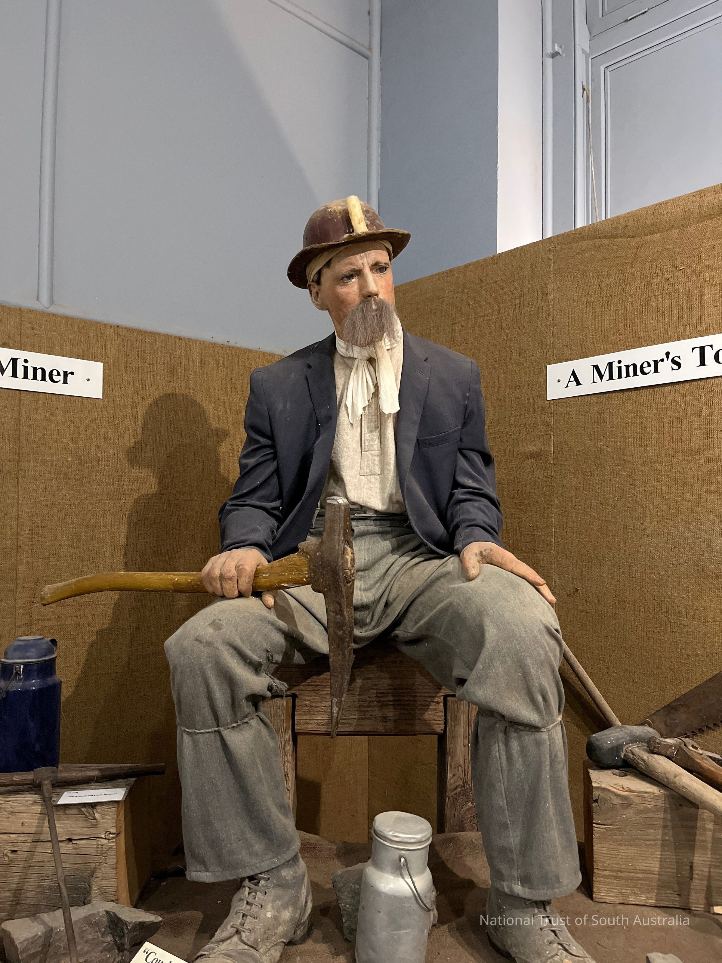 Seated male mannequin, dressed in miner’s clothing and holding a poll pick