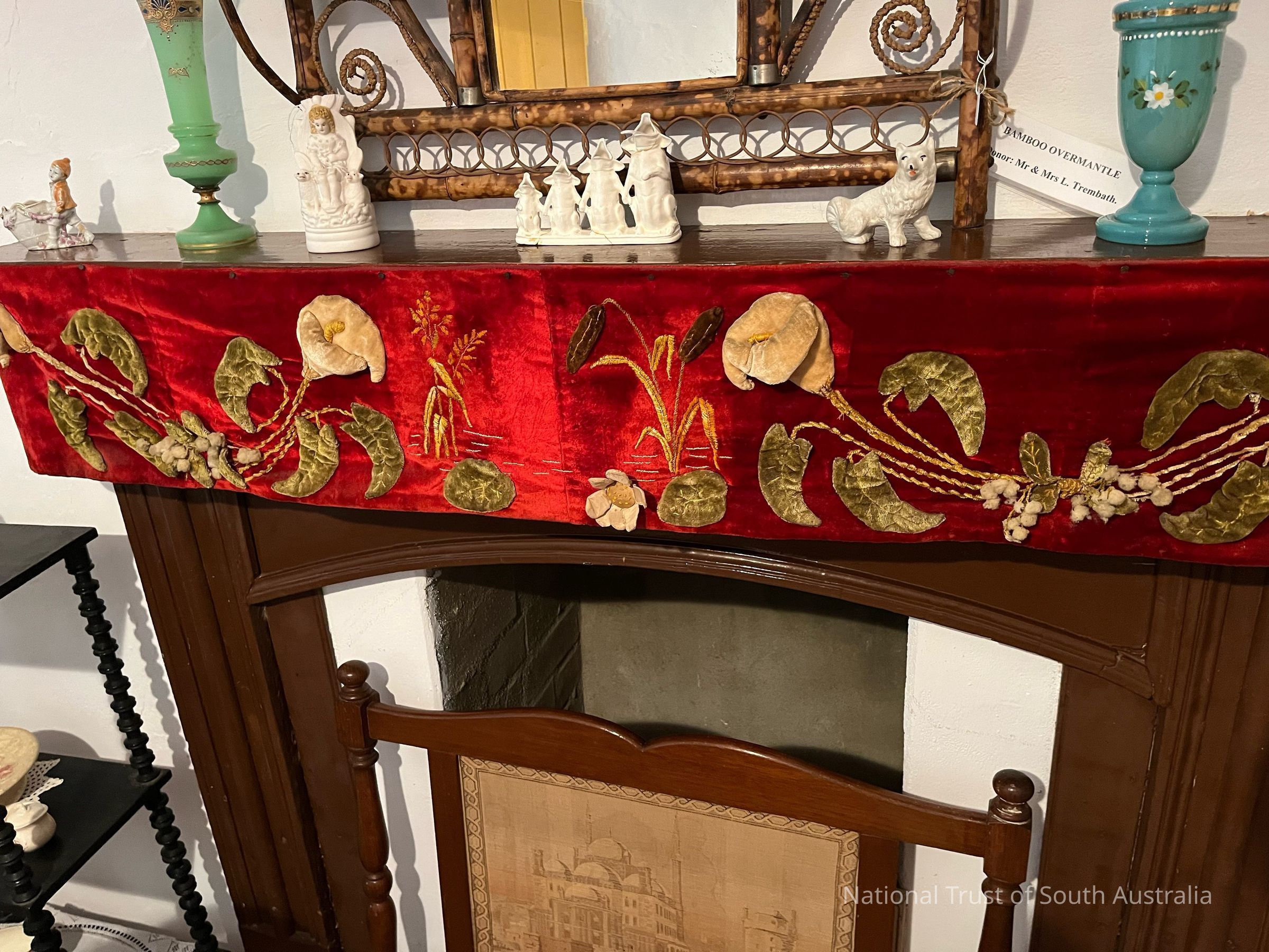 Ornate fabric cover for edge of mantelpiece