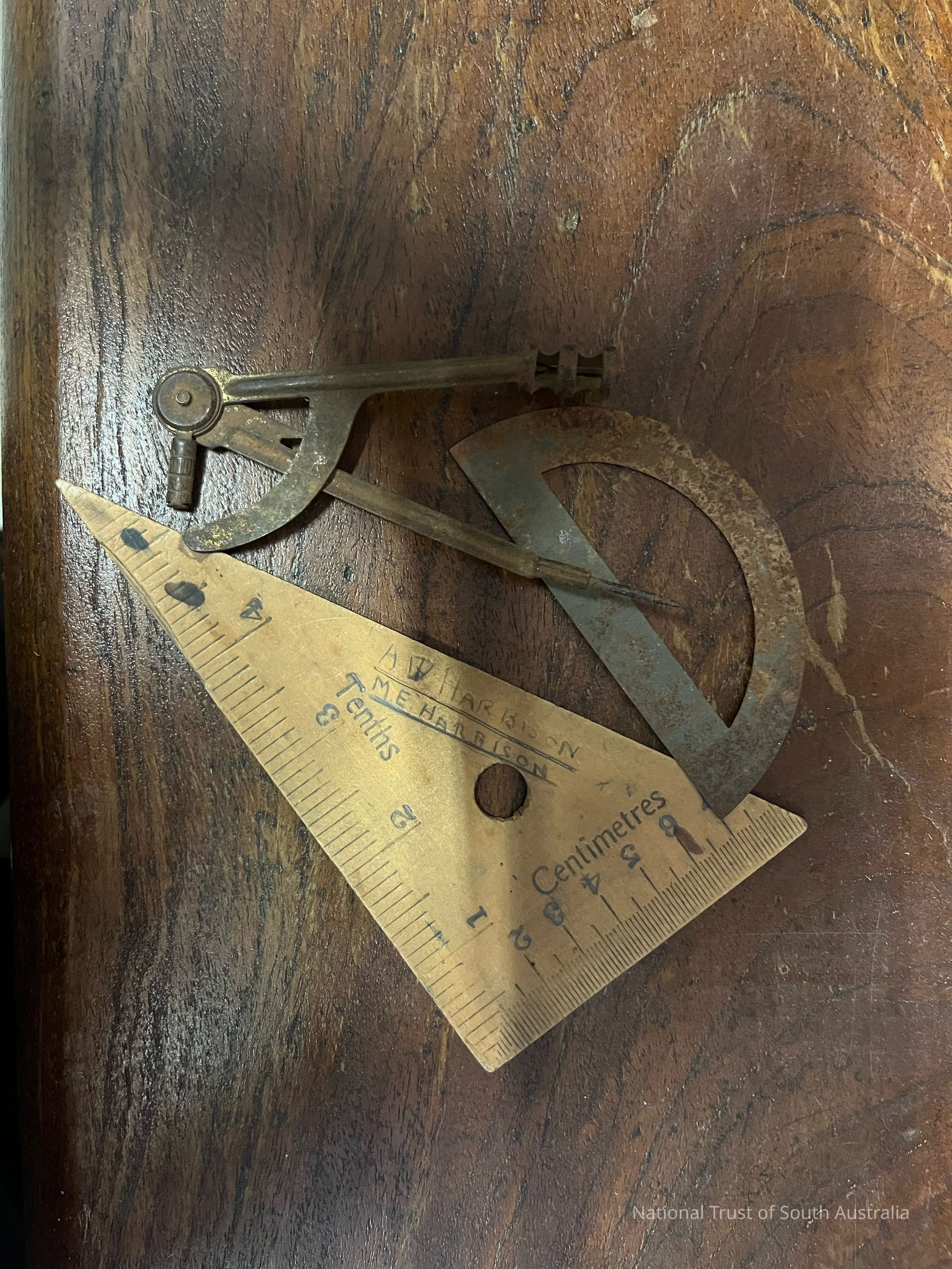 Includes protractor, compass and triangle ruler. Located in Box 15K