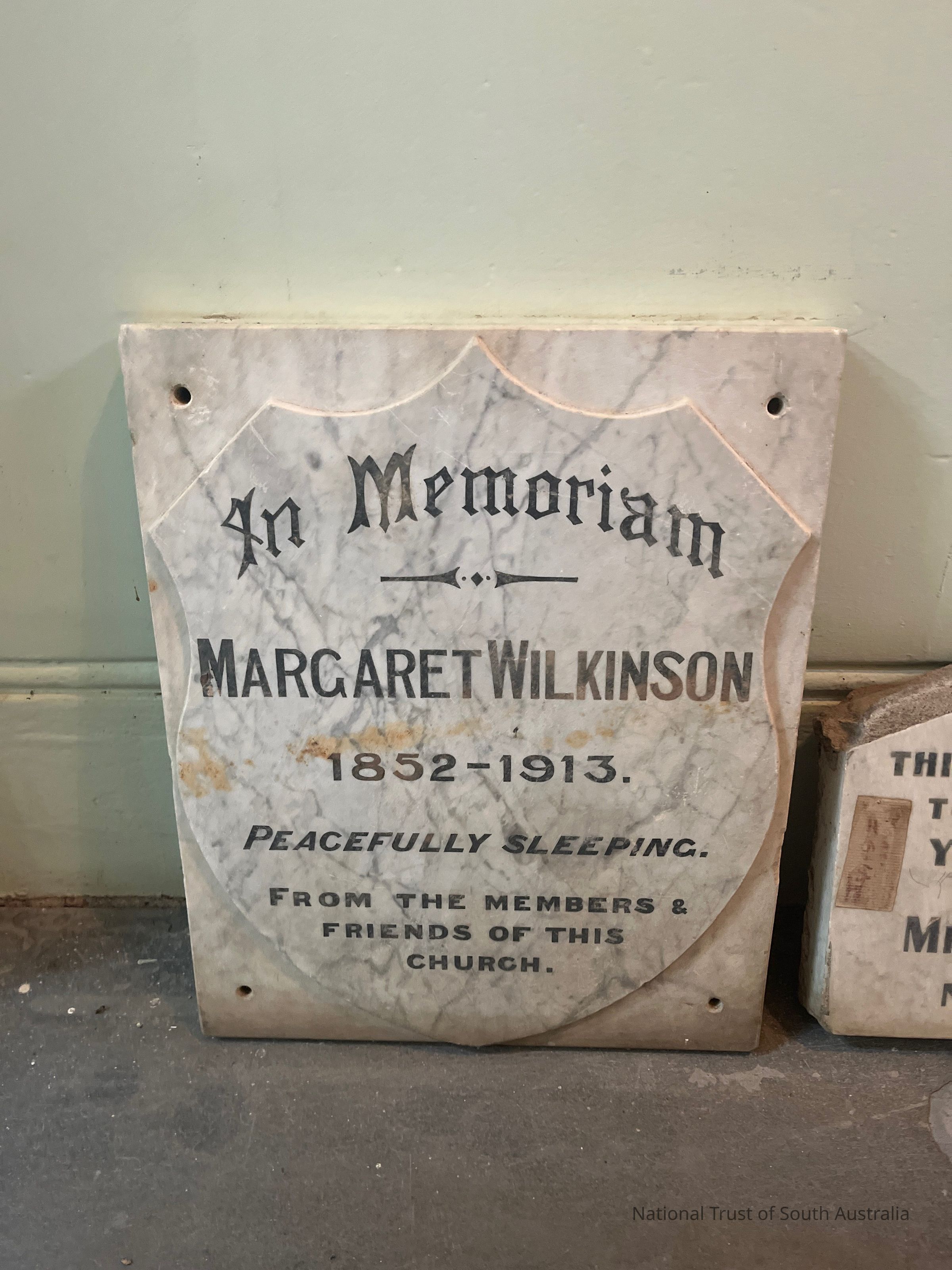 Text: In Memoriam Margaret Wilkinson 1852-1913. Peacefully Sleeping. From the Members & Friends of this Church.