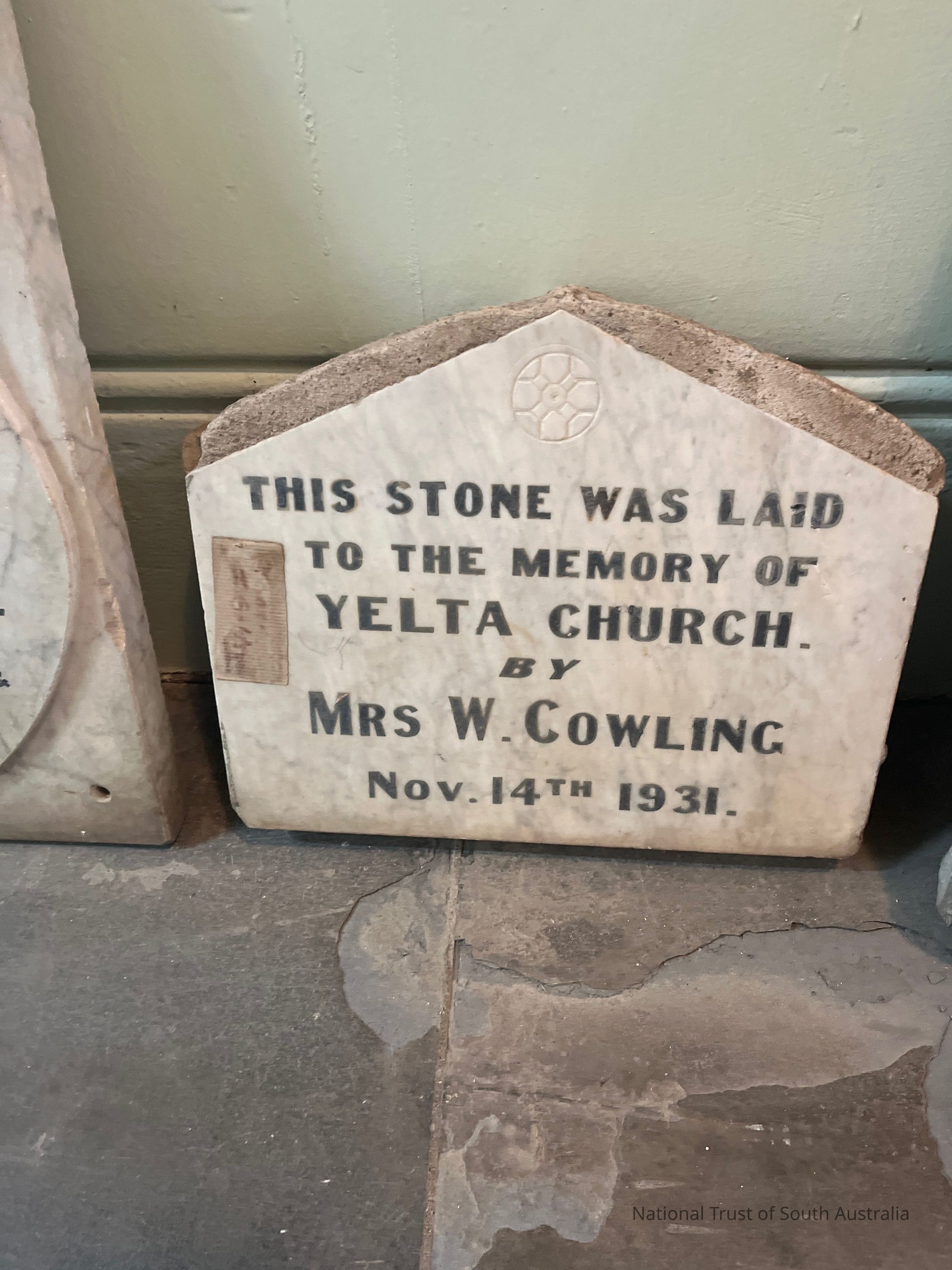 Text: This Stone Was Laid To The Memory of Yelta Church by Mrs W. Cowling Nov. 14th 1931.