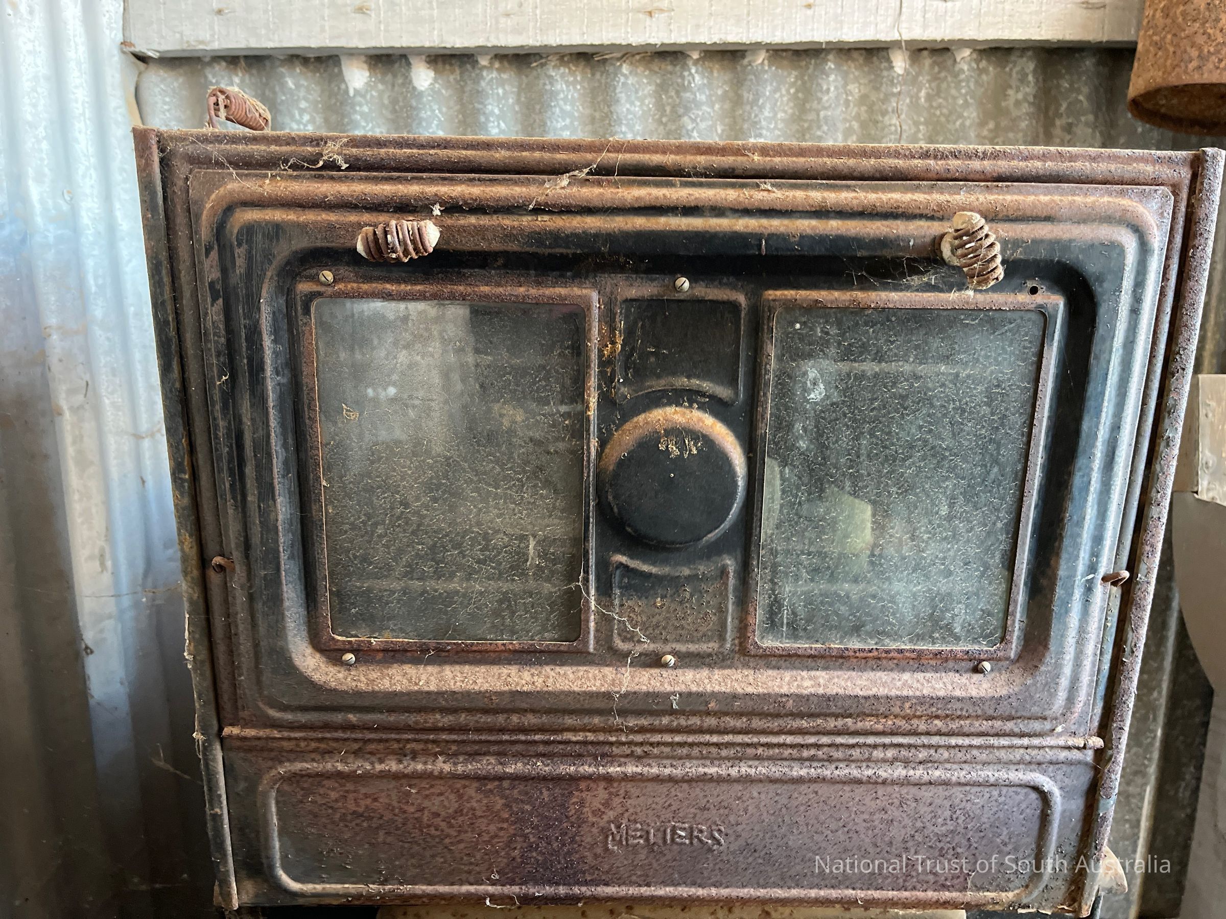 Small oven with glass faces on door. Has two small handles for ease of relocating.