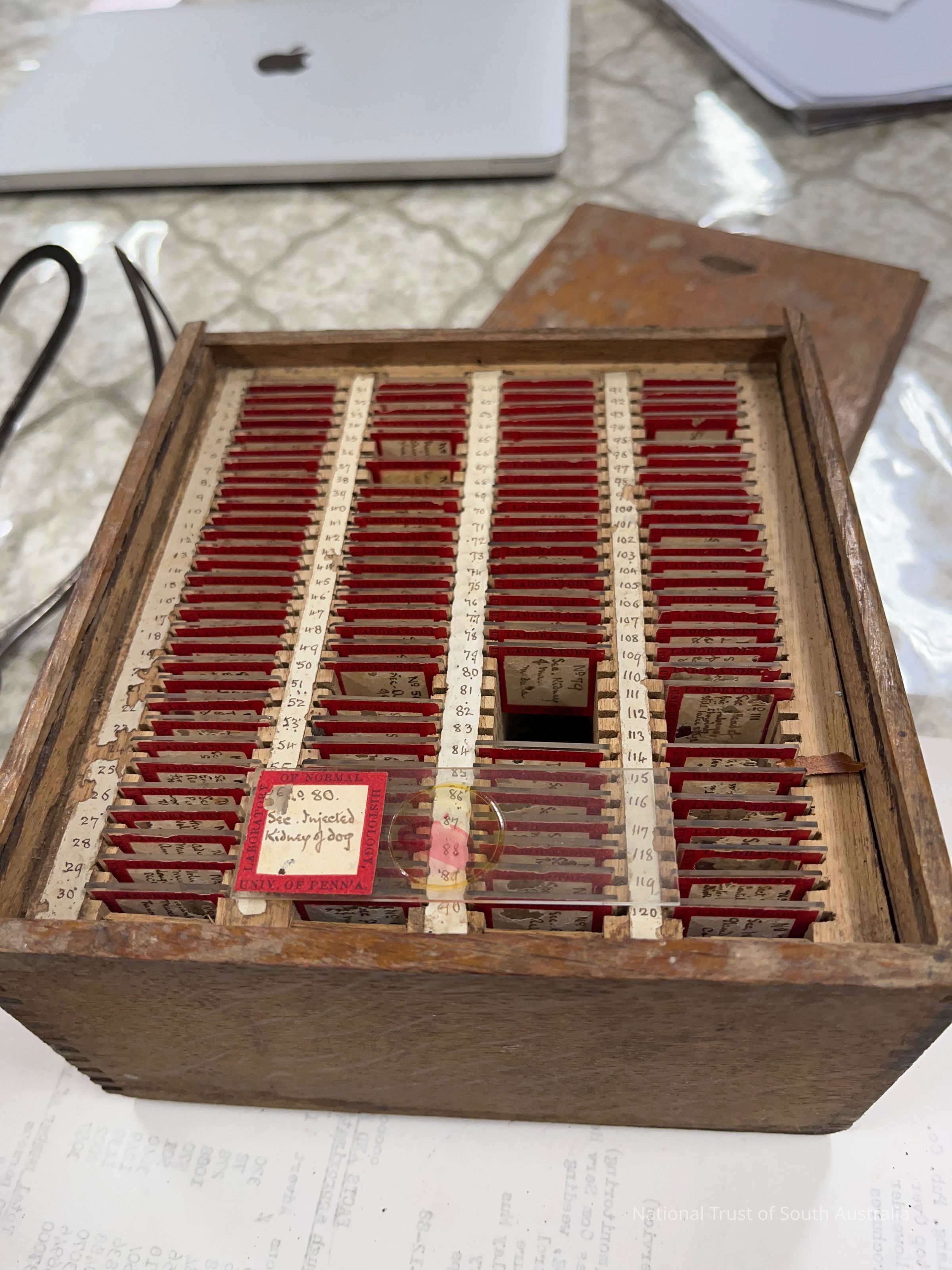 Wooden box contains 111 slides. Each slide is labelled and numbered.