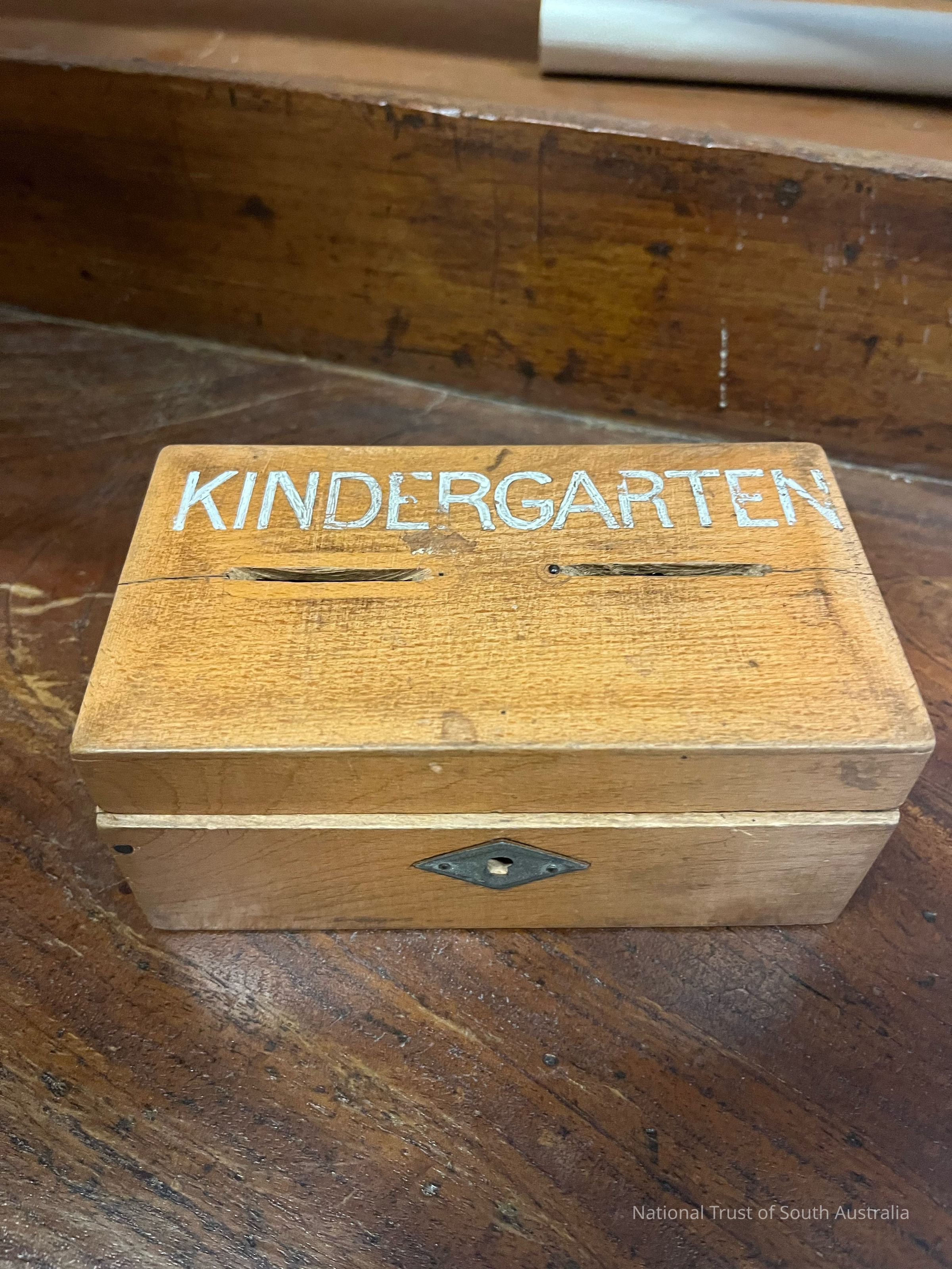 Wooden money box with two coin slots and the word “Kindergarten” written on its lid. Located Box K4