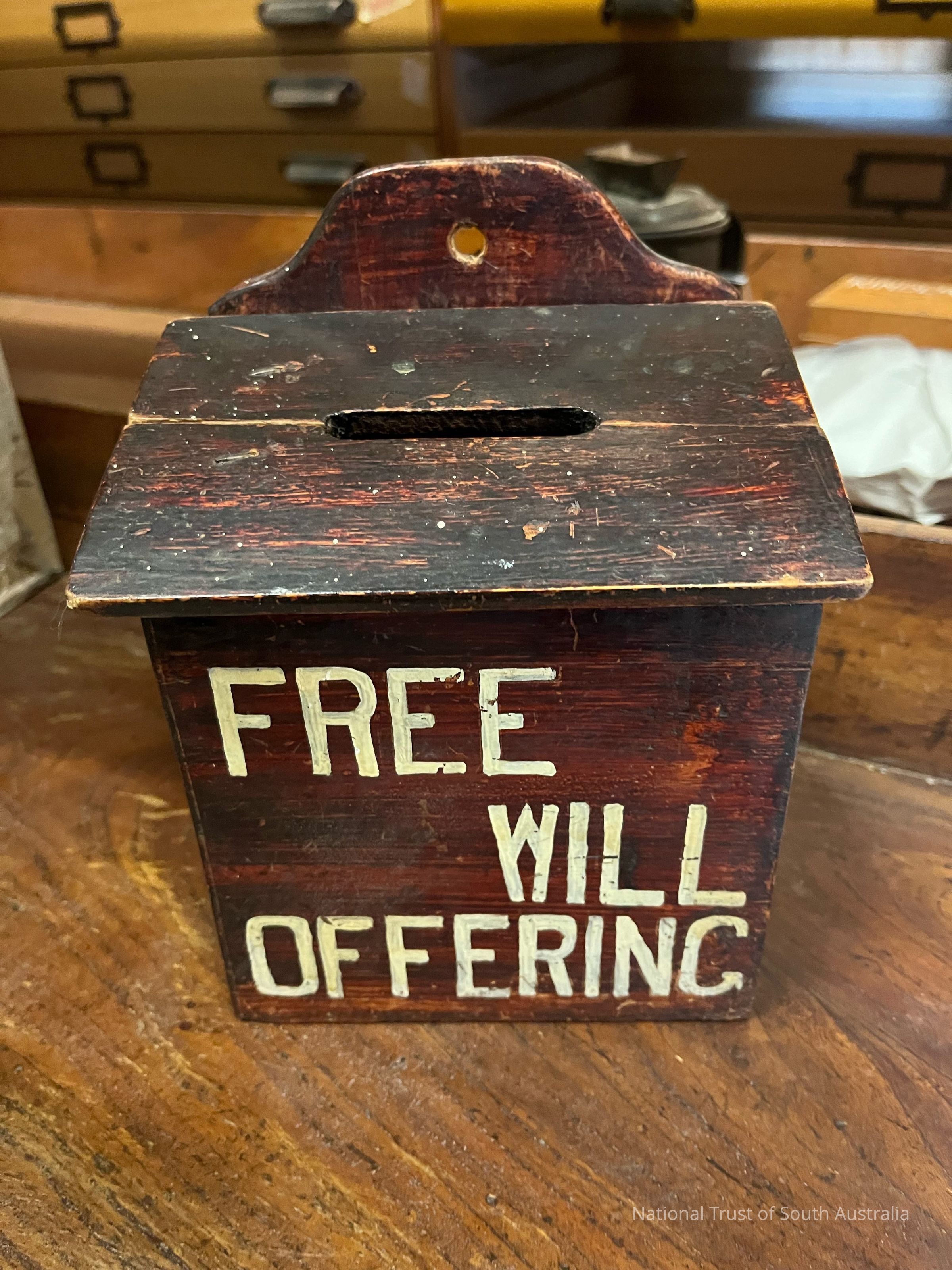 Wooden money box with “Free Will Offering” painted on its front Located Box K4
