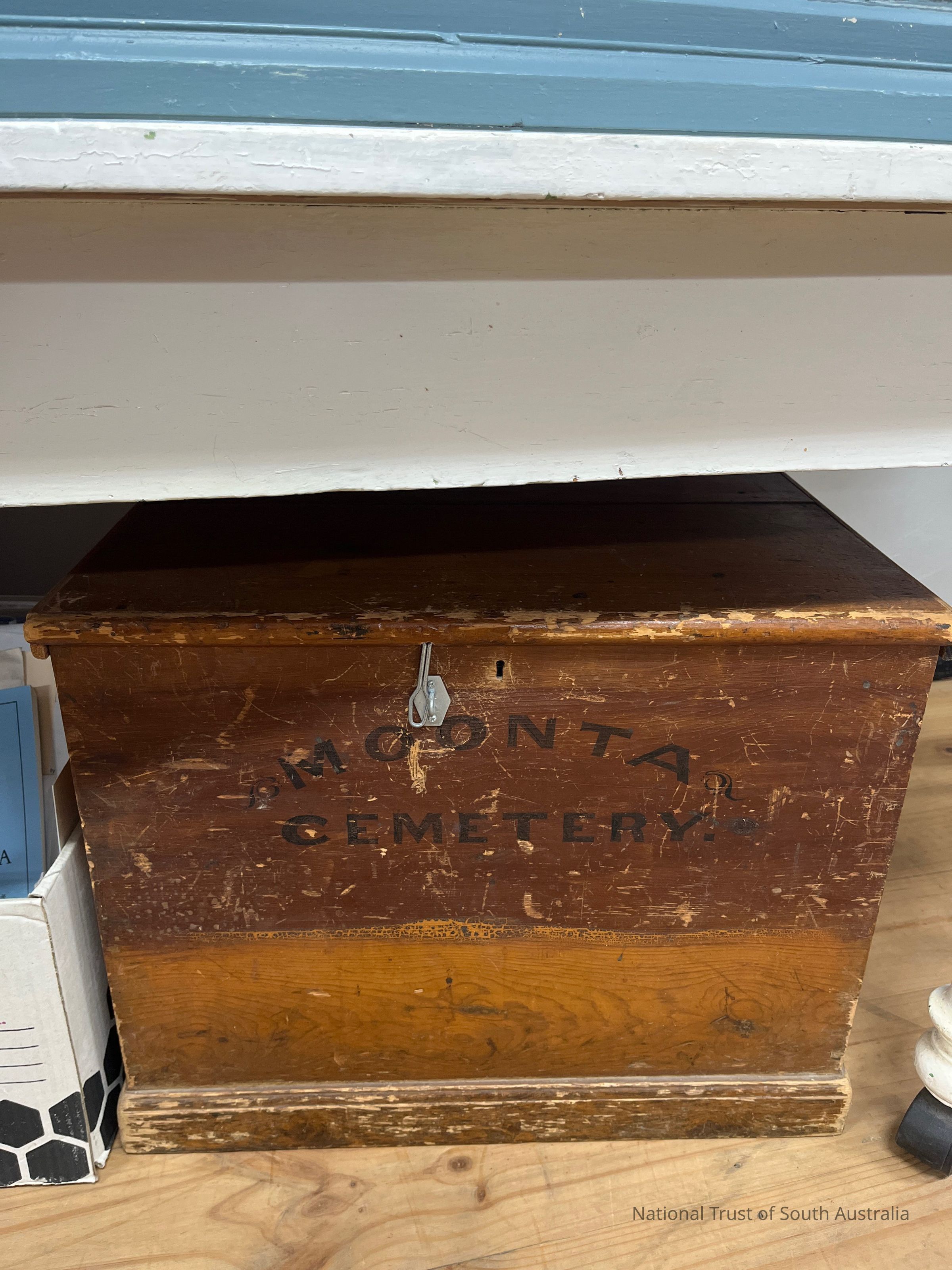 Large wooden box. Printed text reads MOONTA CEMETERY