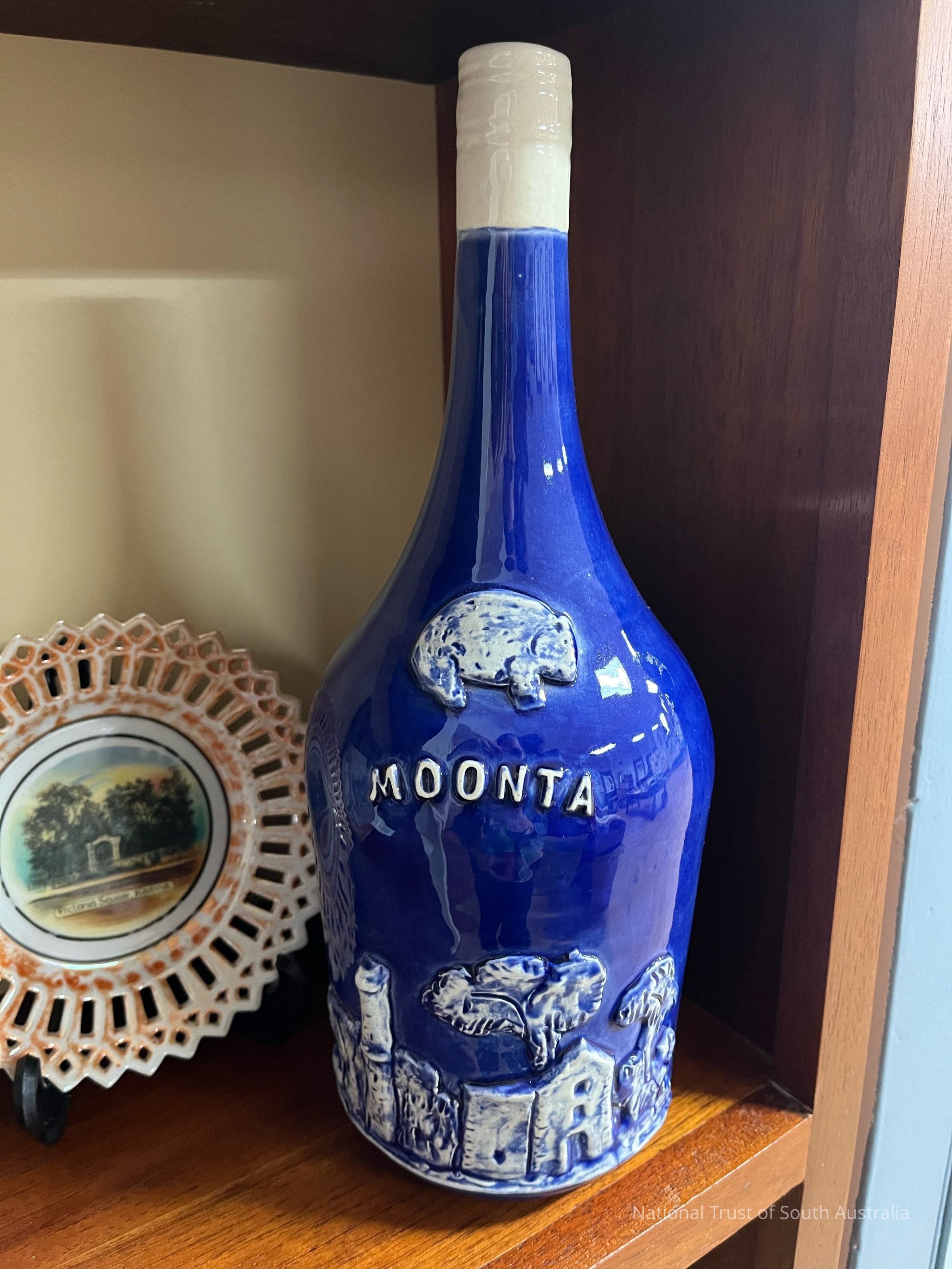 Blue bottle with white decorative features. Includes wombat, townscape and the word “Moonta”.
