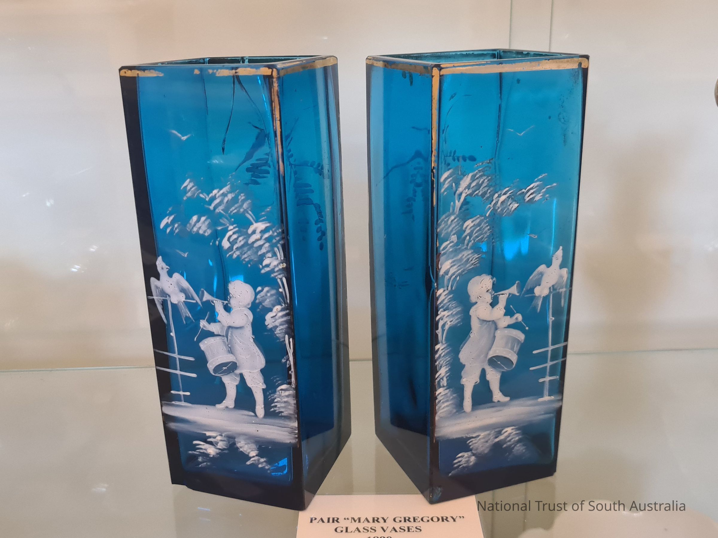 Pair of Blue and White Mary Gregory Glass Vases. Made in USA circa 1890.