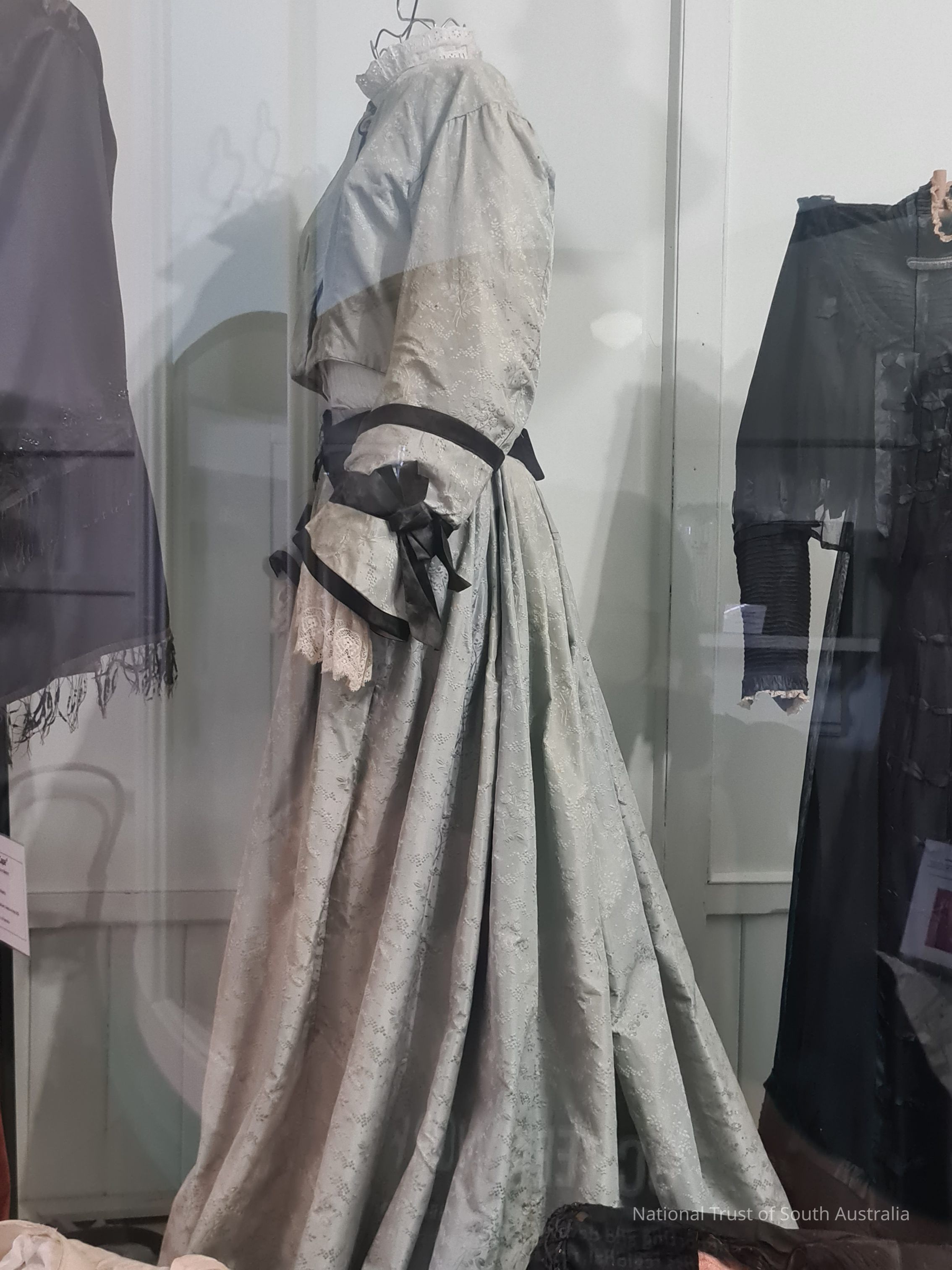 Pale Green gown no bustle with black ribbon and white lace cuffs